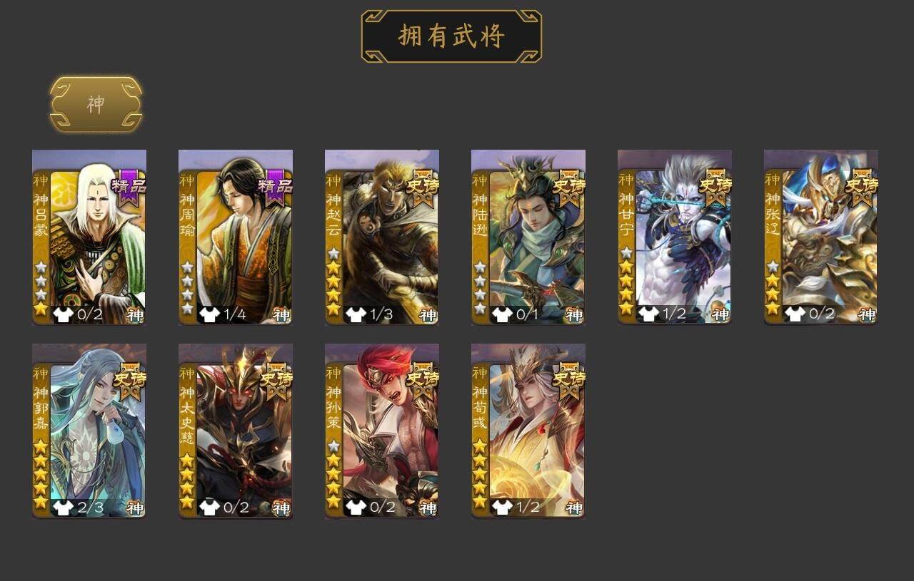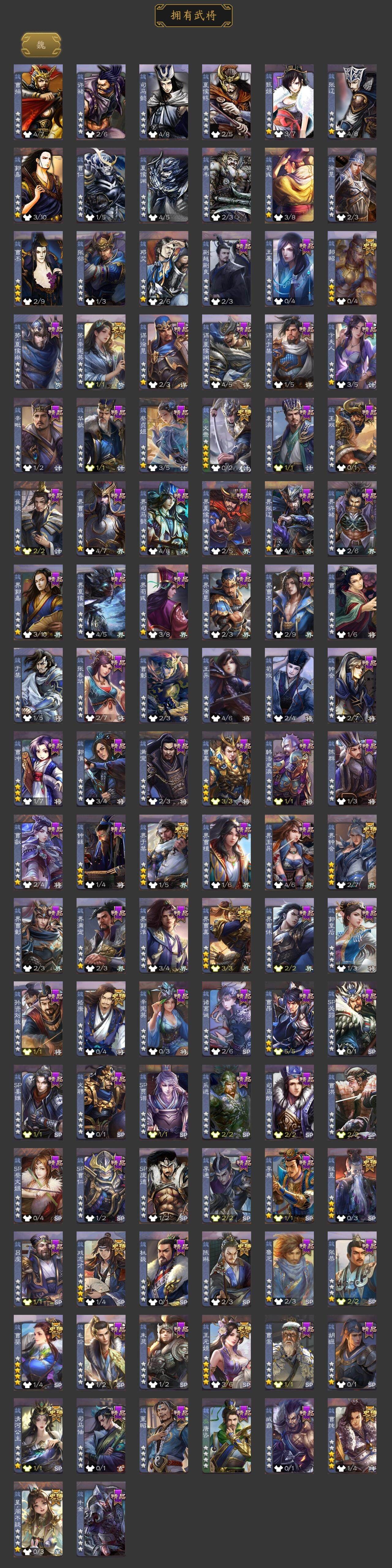 官阶:大将军;VIP等级:VIP11;史诗武将数量:57;动态皮肤数量:48;武将总数:394;史诗宝珠数量:29;将魂数量:5738;神将:8;魏国史诗武将:31;蜀国史诗武将:11;吴国史诗武将:11;群史诗武将:14