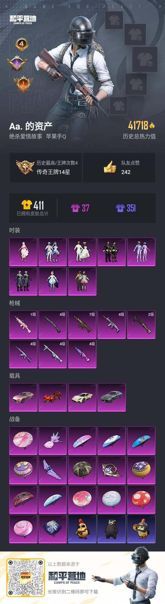 苹果 手Q-8粉装-8特效枪-4载具-3粉色飞行器-41718热力值-4王牌印记-68套装-116枪皮