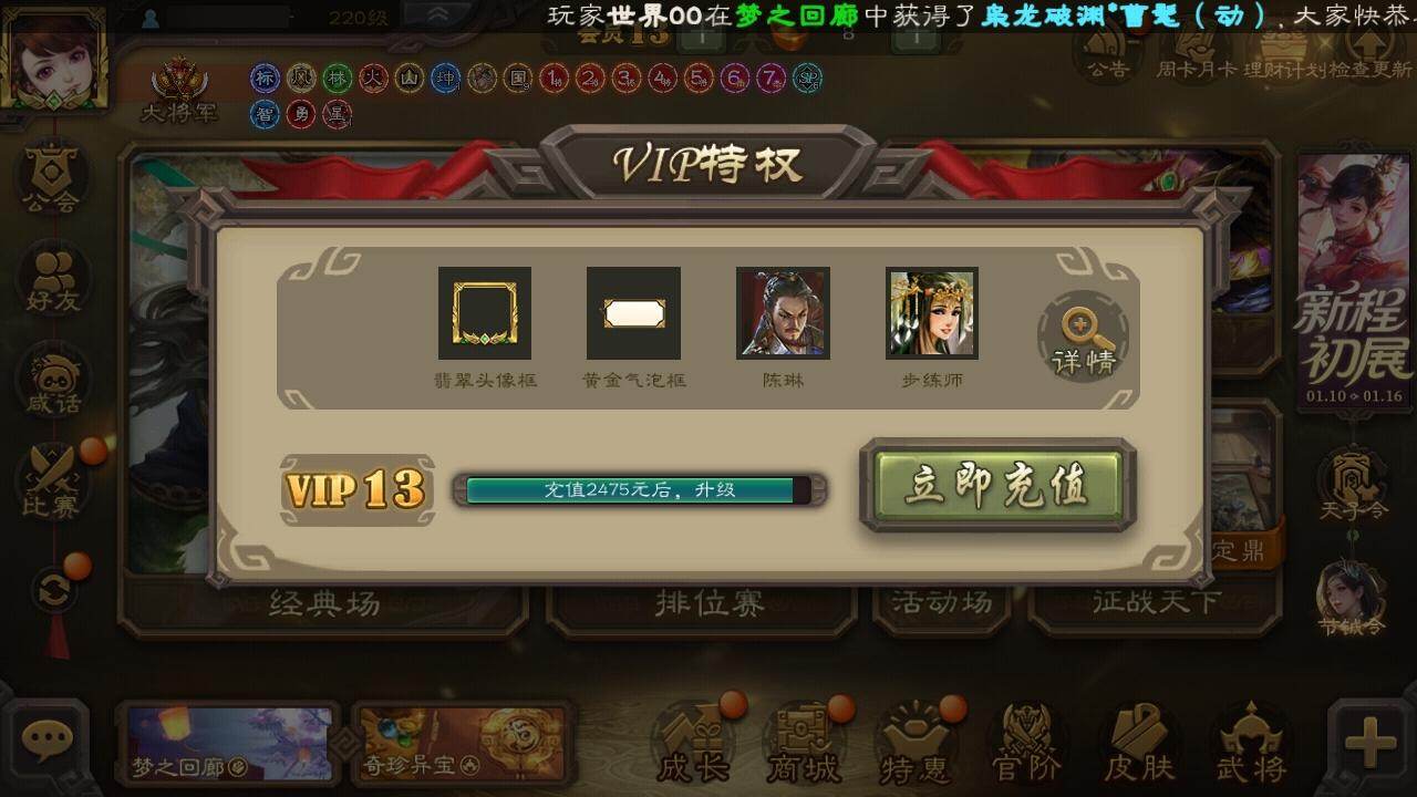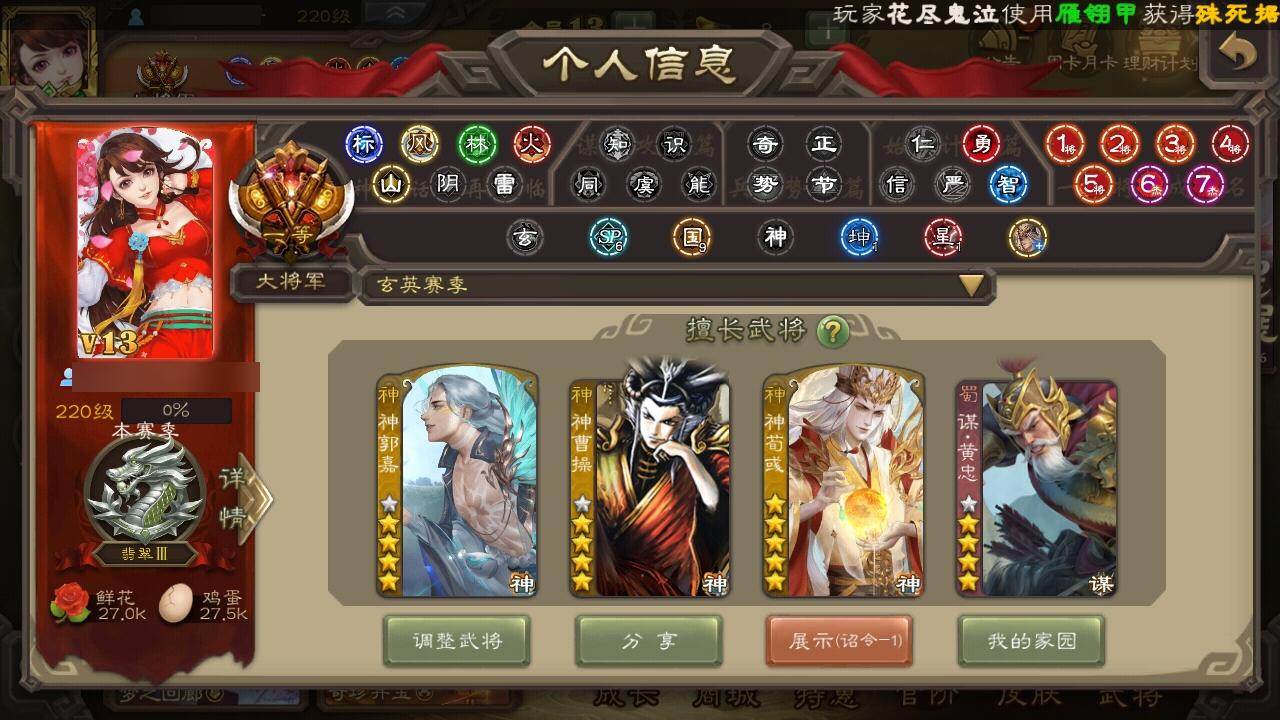 官阶:大将军;VIP等级:VIP13;史诗武将数量:75;动态皮肤数量:38