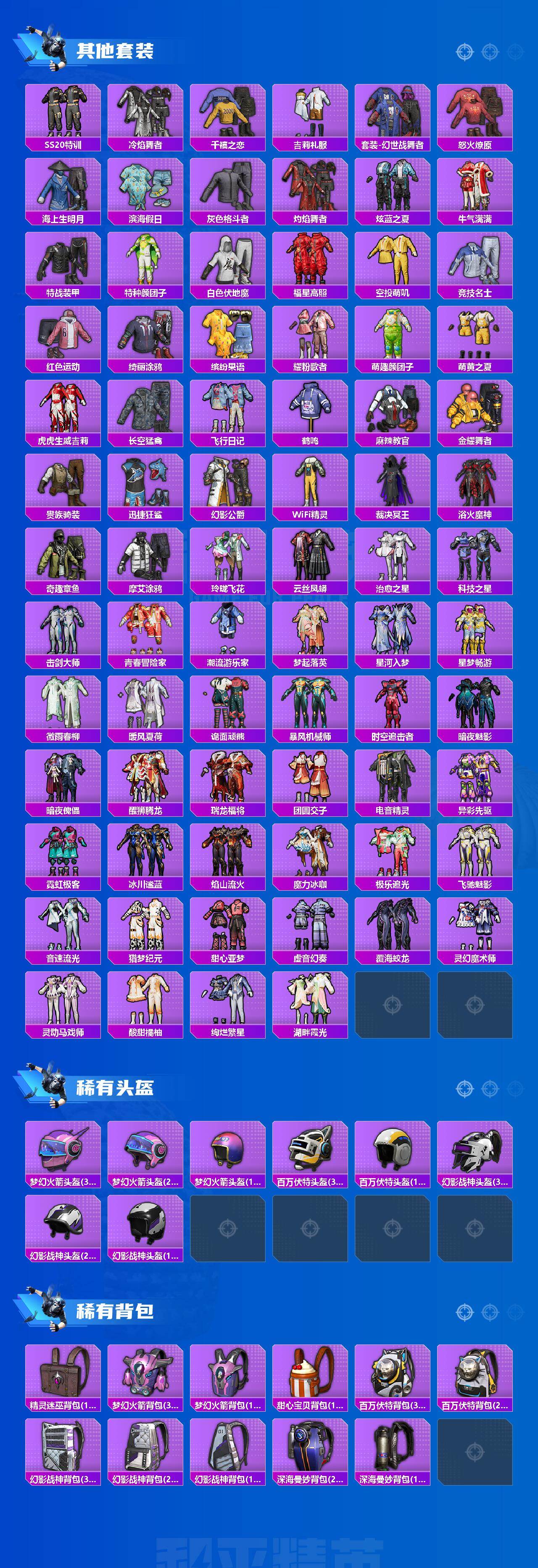 【粉色套装】:粉装-幻影战神,粉装-深渊皇后,粉装-梦幻火箭,粉装-绚金战神,粉装-冰霜白皇,粉装-甜梦冰蝶,粉装-铁血龙王,粉装-暗夜玫瑰,粉装-齐天大圣,角色-洛天依,粉装-暗星紫秘,粉装-岚岚物语,角色-复仇流浪者