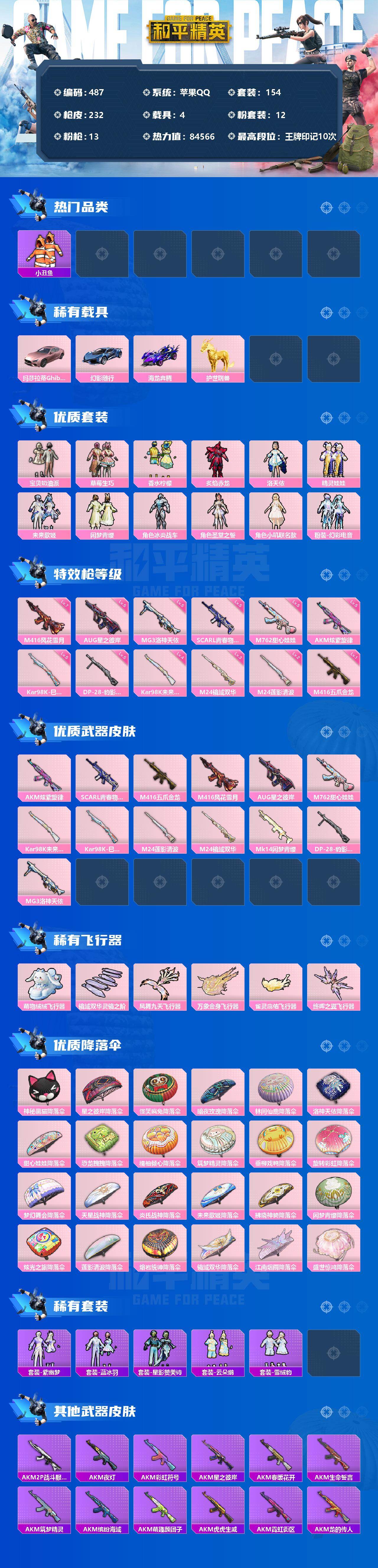 【商品标题】:苹果 手Q-12粉装-13特效枪-4载具-6粉色飞行器-84566热力值-10王牌印记-154套装-232枪皮