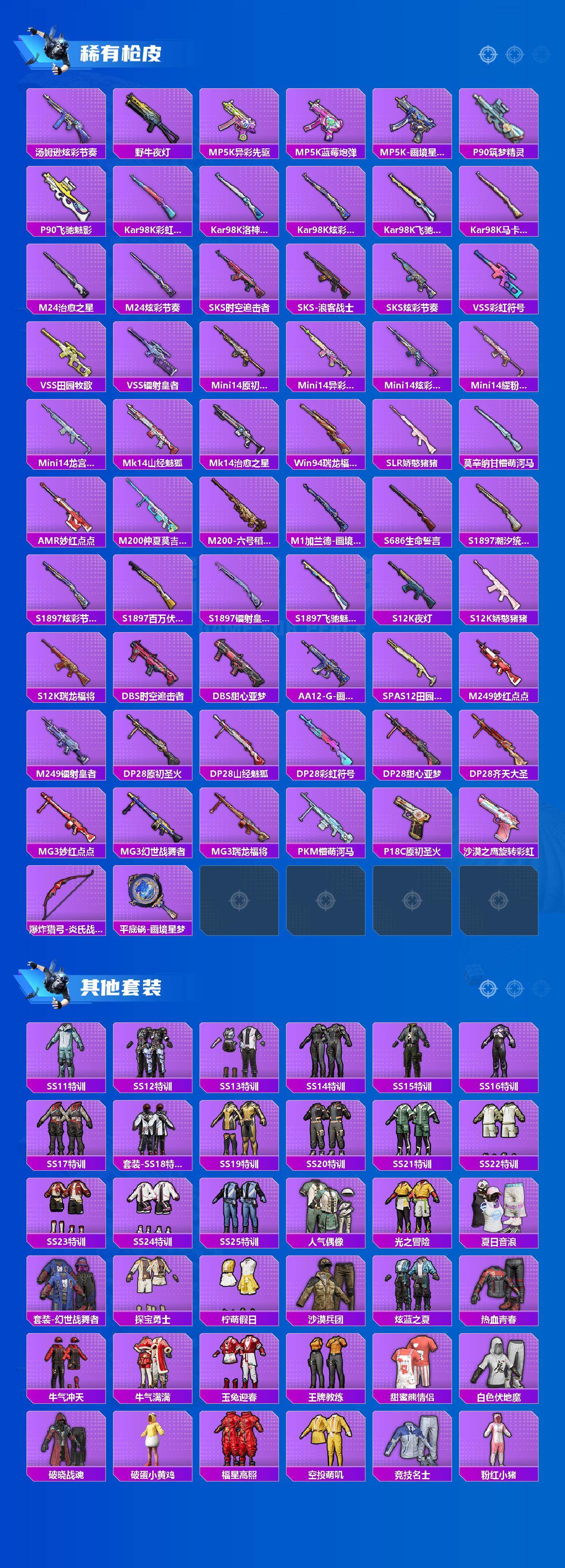 【粉色枪皮等级】:M416-五爪金龙(七级),M416-心之恋语(四级),GROZA-香水柠檬(四级),M762-激战未来(七级),AKS-74U-森灵之息(四级),Kar98K-巳巳如意(四级),Mini14-荧光虫舞(四级)