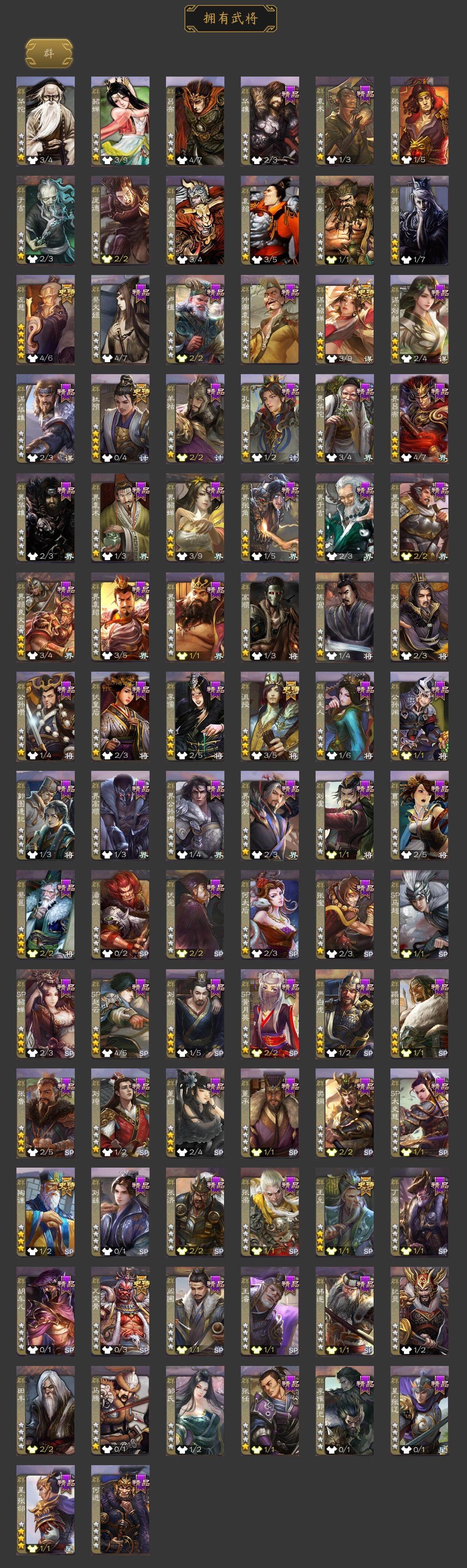 官阶:大将军;VIP等级:VIP8;史诗武将数量:31;动态皮肤数量:33;武将总数:364;史诗宝珠数量:4;将魂数量:3973;神将:3;魏国史诗武将:19;蜀国史诗武将:8;吴国史诗武将:6;群史诗武将:7