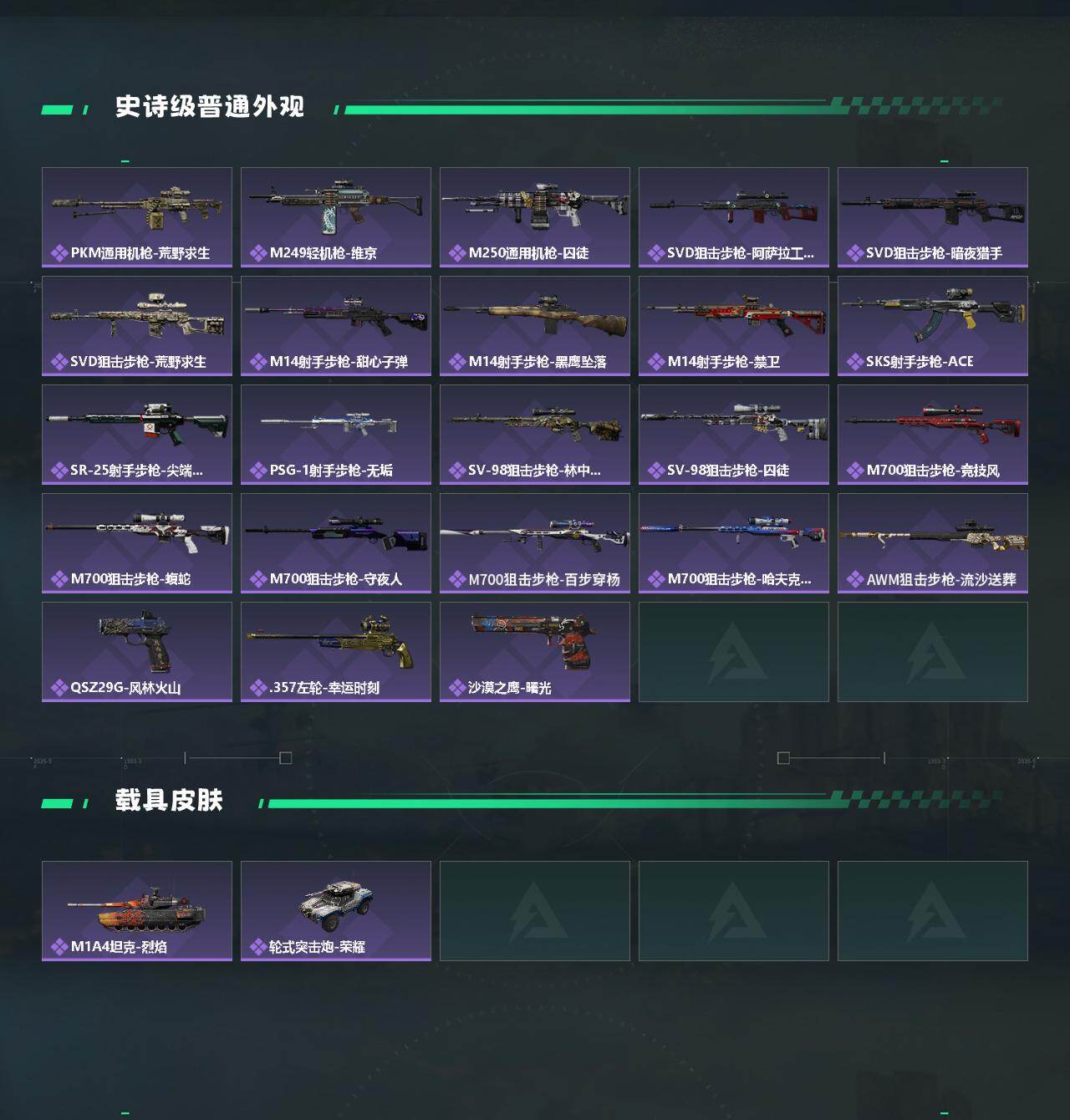 【传说外观】:M4A1突击步枪-蚀金玫瑰,M4A1突击步枪-阿米娅,AKM突击步枪-零度协议,ASh-12战斗步枪-怜悯,ASh-12战斗步枪-鹅鸭