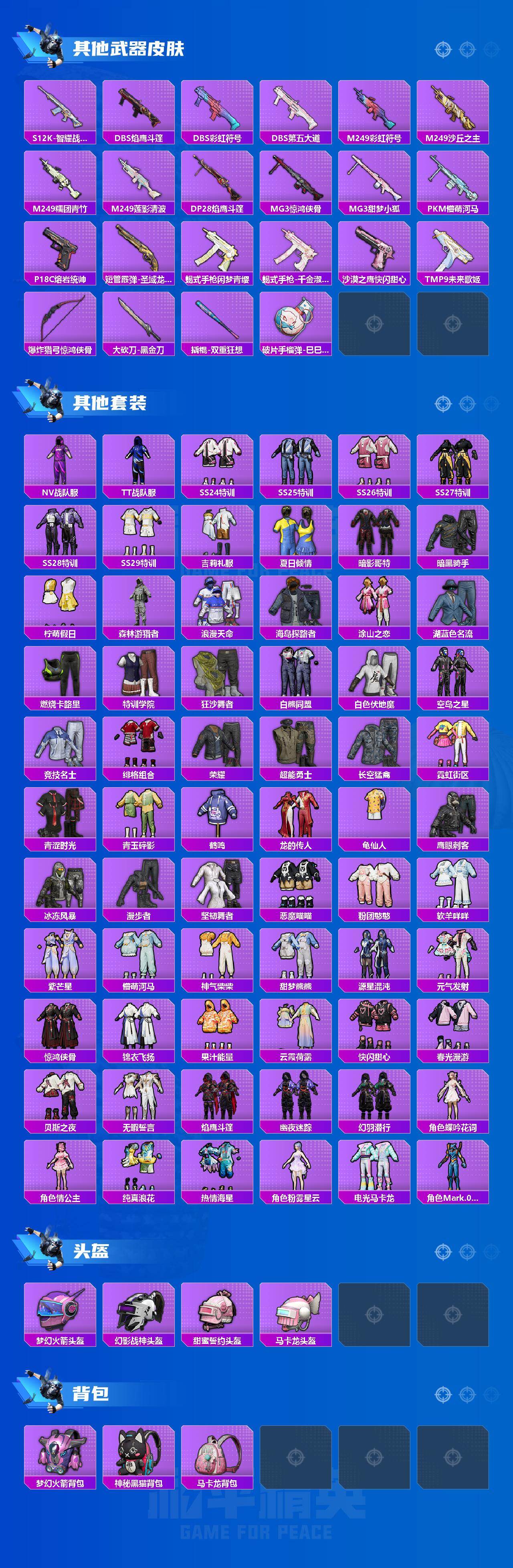 【热门品类】:粉装-梦幻火箭,套装-浪漫天命,套装-都市猎人,套装-小丑鱼,套装-金羽特工,角色-忠猛周仓,套装-龟仙人,套装-暗影哥特,角色-Mark.06,熔岩游骑兵面罩,熔岩游骑兵连帽夹克