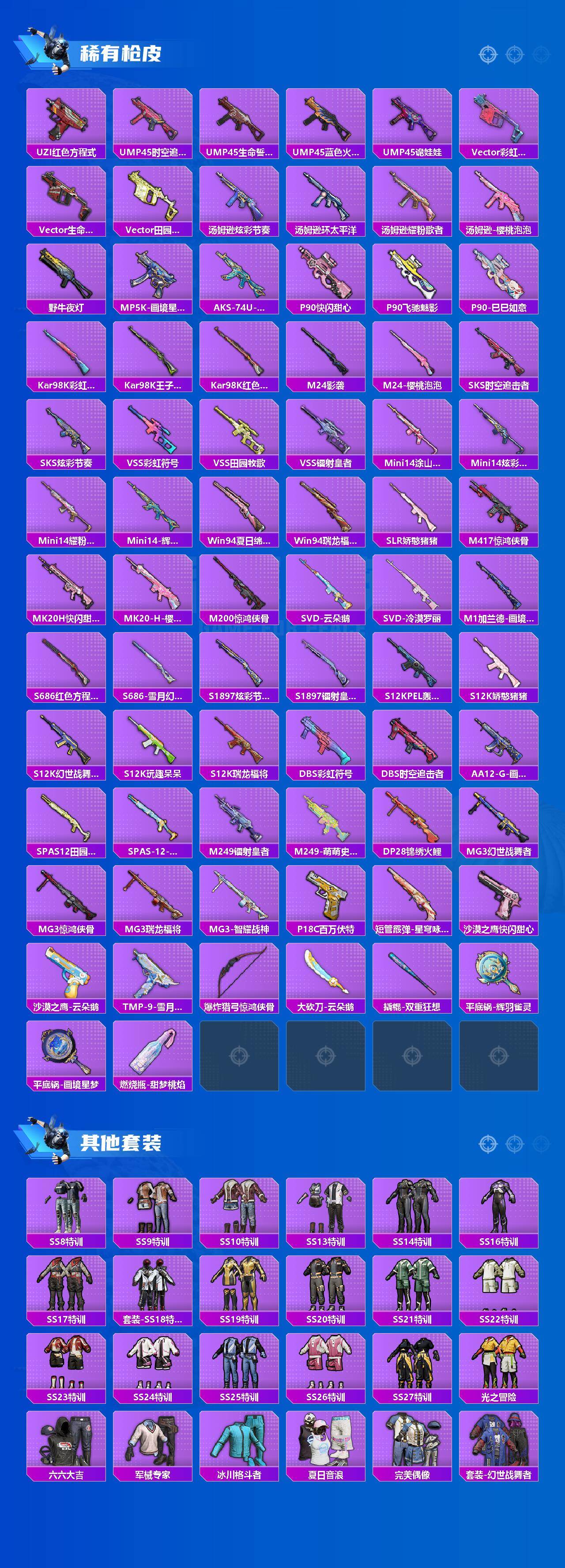 1神装-4粉装-4特效枪-4载具-2粉色飞行器-57926热力值-8王牌印记-122套装-177枪皮