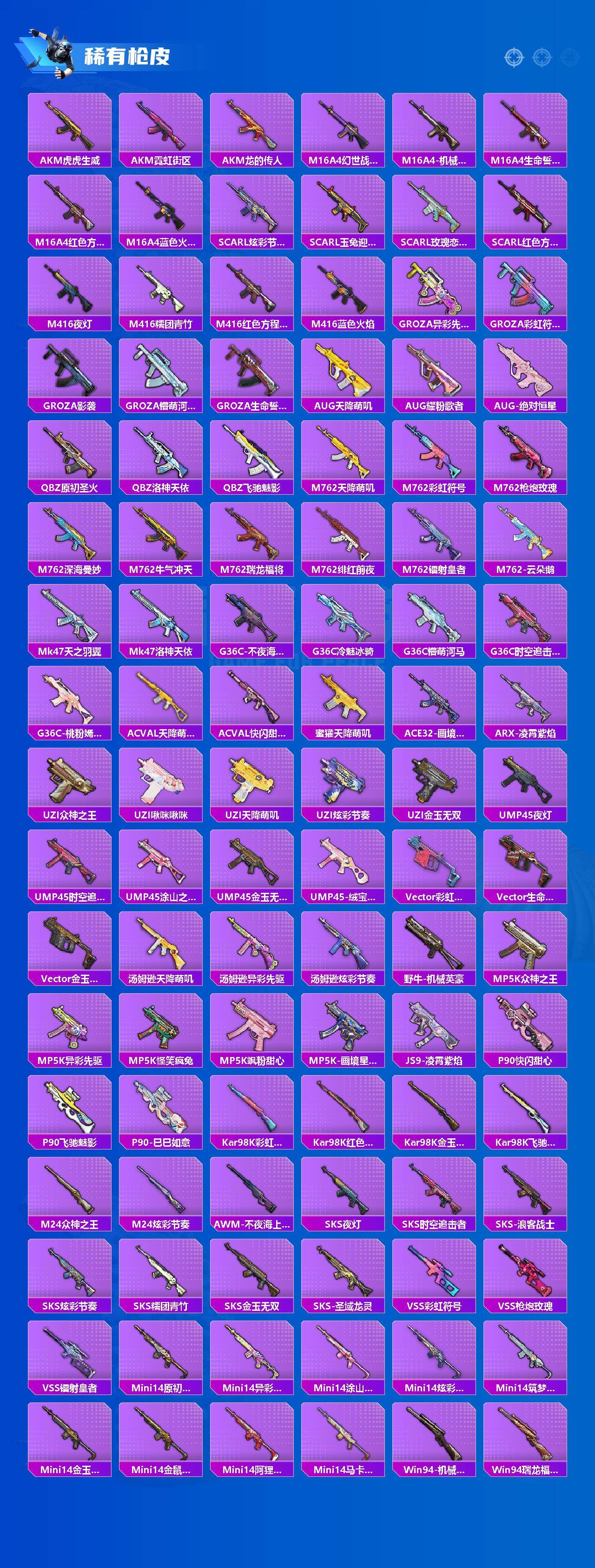 【粉色枪皮等级】:AKM-白勺歌姬(七级),SCAR-L-纯梦嫁纱(七级),M416-心之恋语(七级),GROZA-镜光银凌(五级),AUG-暖羊咩咩(五级),M762-冷魅冰骑(七级),Kar98K-