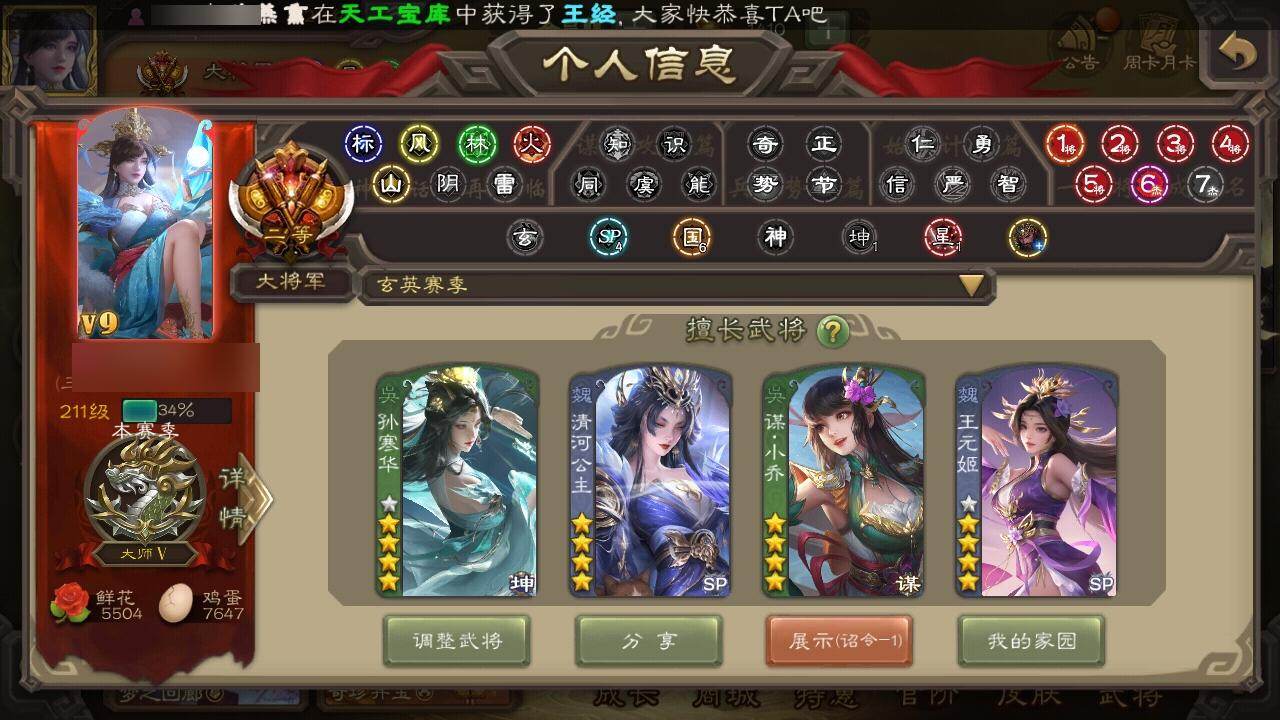 官阶:大将军;VIP等级:VIP9;史诗武将数量:53;动态皮肤数量:46;