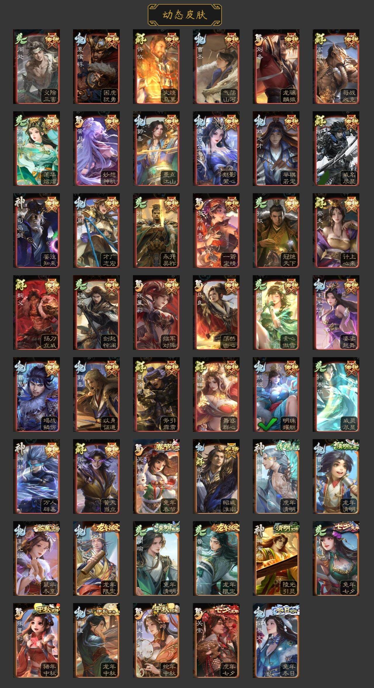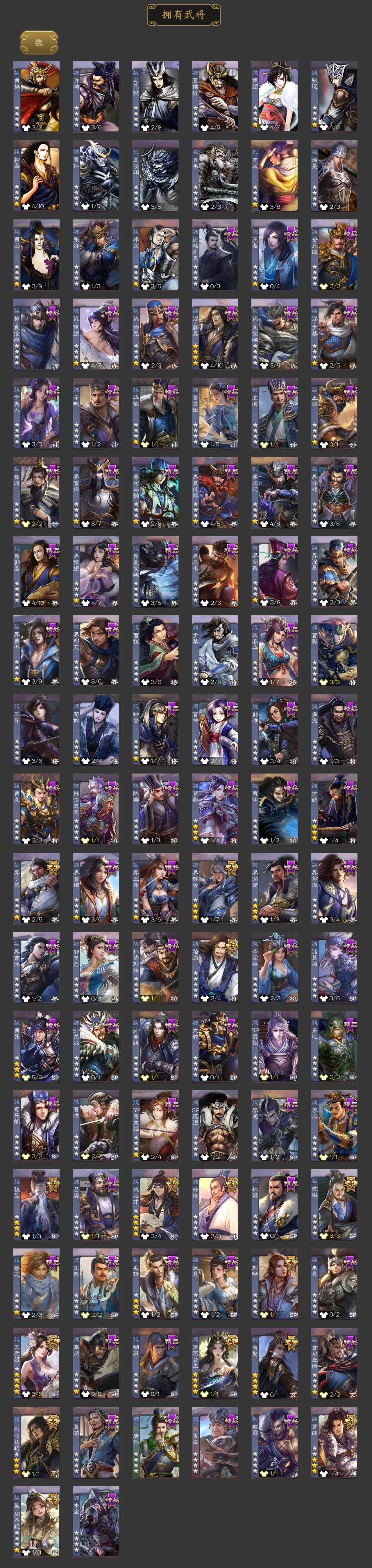 神吕布,神赵云,神陆逊,神张辽,曹髦,星周不疑,杨修,王元姬,界钟会,界于禁,嵇康,陈琳,曹纯,戏志才,刘晔,清河公主,程昱,关索,谋刘备,谋赵云,谋马超,诸葛瞻,赵襄,张星彩,王平,沙摩柯,傅佥,花鬘,董允,谋关羽,吴景,孙寒华,骆统,界朱然,界徐盛,贺齐,势陆郁生,势太史慈,裴