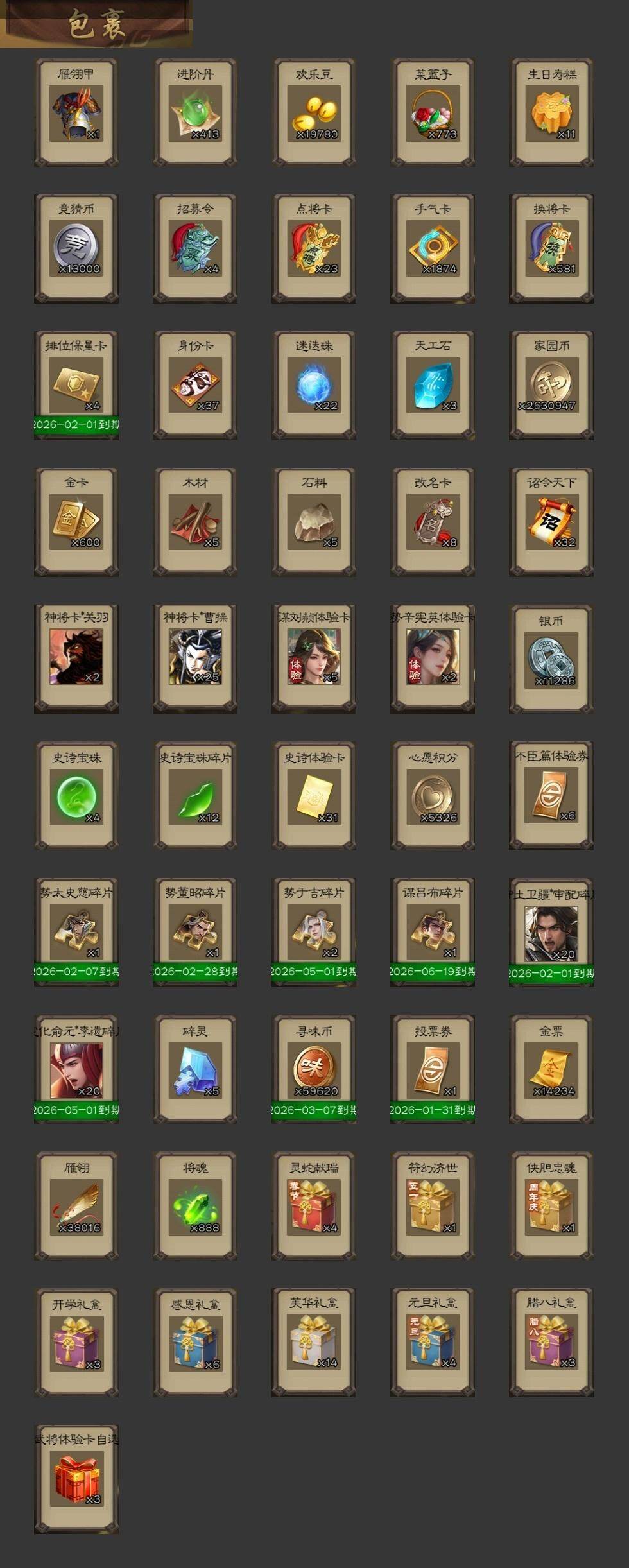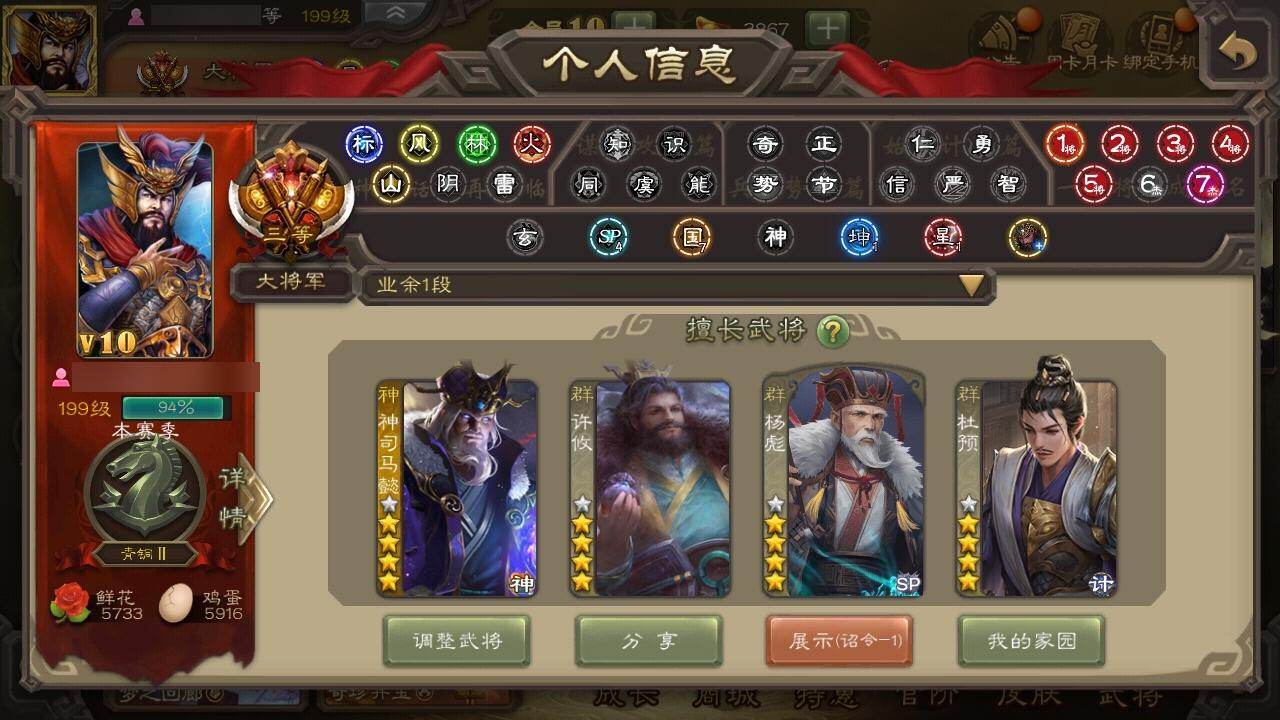 官阶:大将军;VIP等级:VIP10;史诗武将数量:42;动态皮肤数量:26;武将总数:372;史诗宝珠数量:4;将魂数量:888;神将:4;魏国史诗武将:12;蜀国史诗武将:6;吴国史诗武将:6;群史诗武将:16
