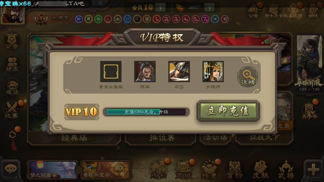 官阶:大将军;VIP等级:VIP10;史诗武将数量:42;动态皮肤数量:26