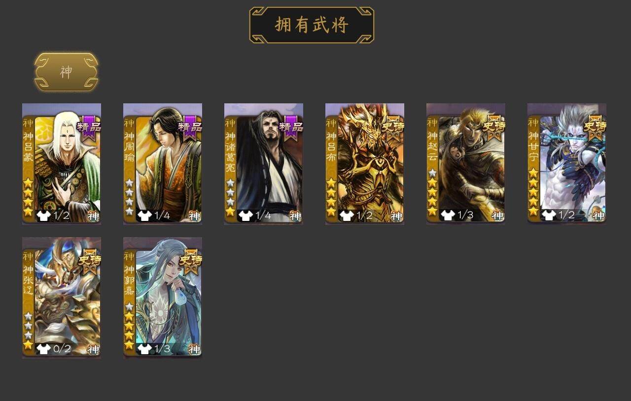 神吕布,神赵云,神甘宁,神张辽,神郭嘉,神吕蒙,神周瑜,神诸葛亮,SP司马昭,杨修,文鸯,王元姬,马钧,界钟会,界于禁,嵇康,郝昭,陈琳,曹婴,曹纯,戏志才,刘晔,清河公主,关索,谋马超,赵襄,张星彩,王平,沙摩柯,花鬘,周处,吴景,孙皓,骆统,留赞,界朱然,界徐盛,界步练师,贺齐