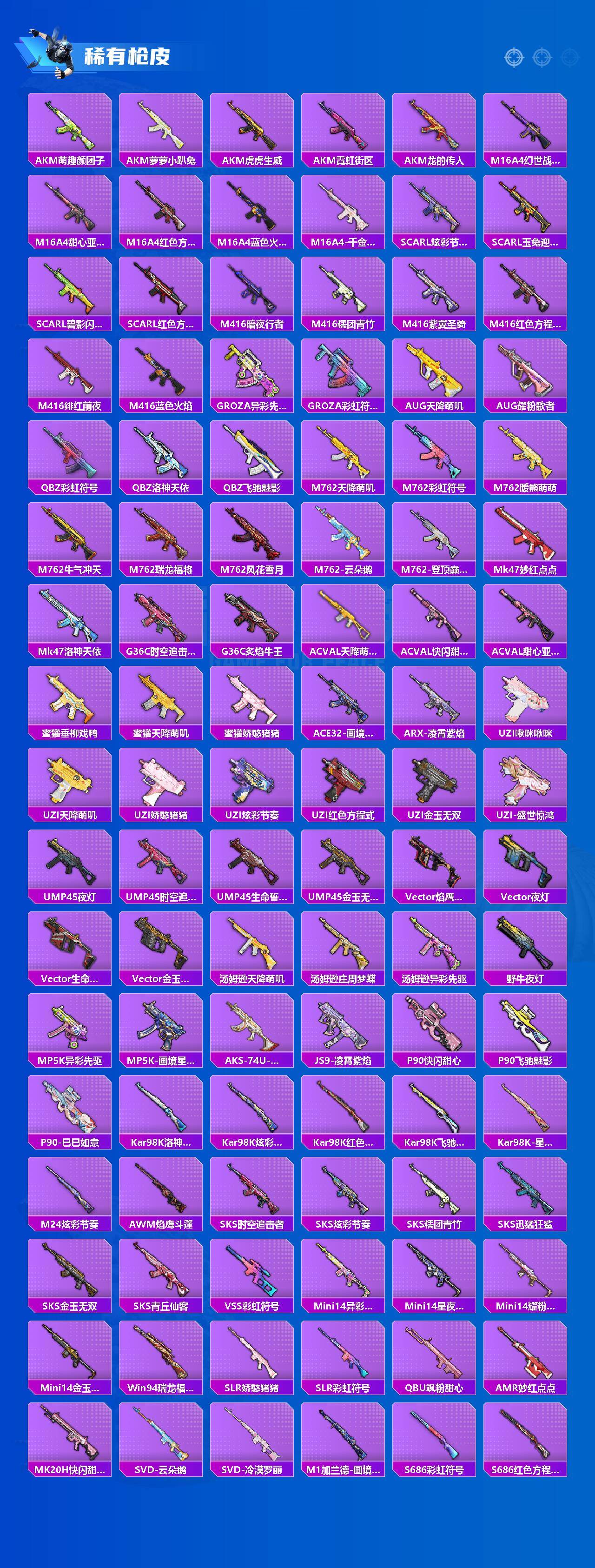 【粉色枪皮等级】:AKM-绿萝繁花(五级),SCAR-L-锦绣绵绵(五级),M416-电玩时刻(五级),GROZA-镜光银凌(五级),AUG-暖羊咩咩(五级),M762-青锋波束(五