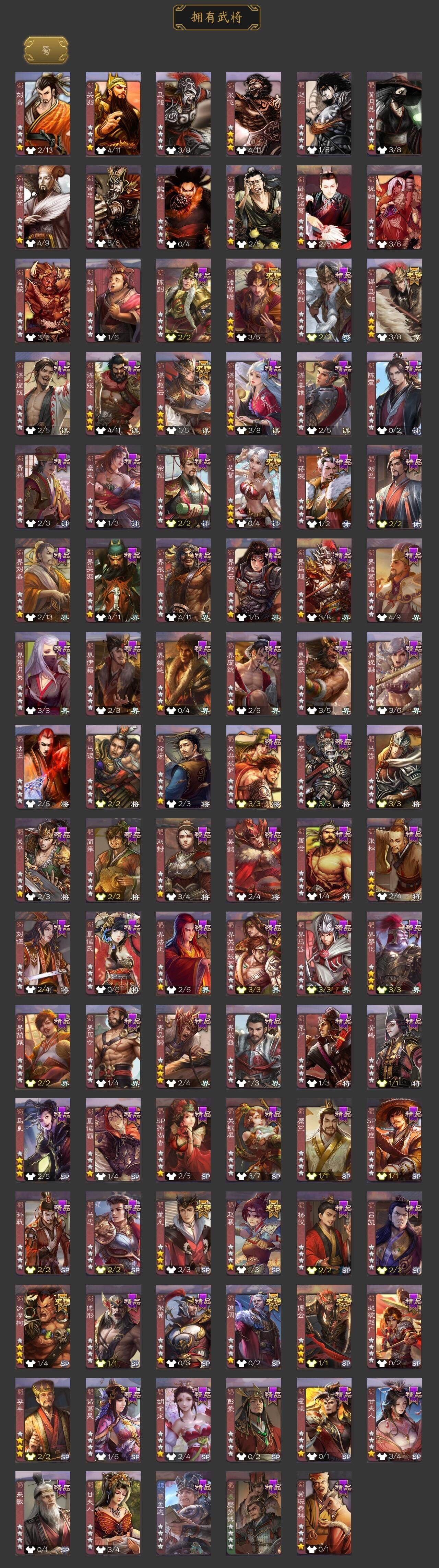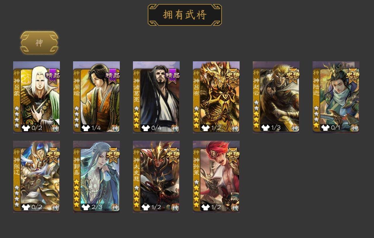 神吕布,神赵云,神陆逊,神张辽,神郭嘉,神太史慈,神孙策,神诸葛亮,杨修,界钟会,界于禁,界曹真,郝昭,曹婴,曹纯,戏志才,清河公主,程昱,谋赵云,谋马超,诸葛瞻,赵襄,沙摩柯,谯周,傅佥,花鬘,董允,周处,吴景,骆统,界朱然,界徐盛,势陆郁生,文鸯,裴秀,左慈,郑玄,张让,杨彪,星