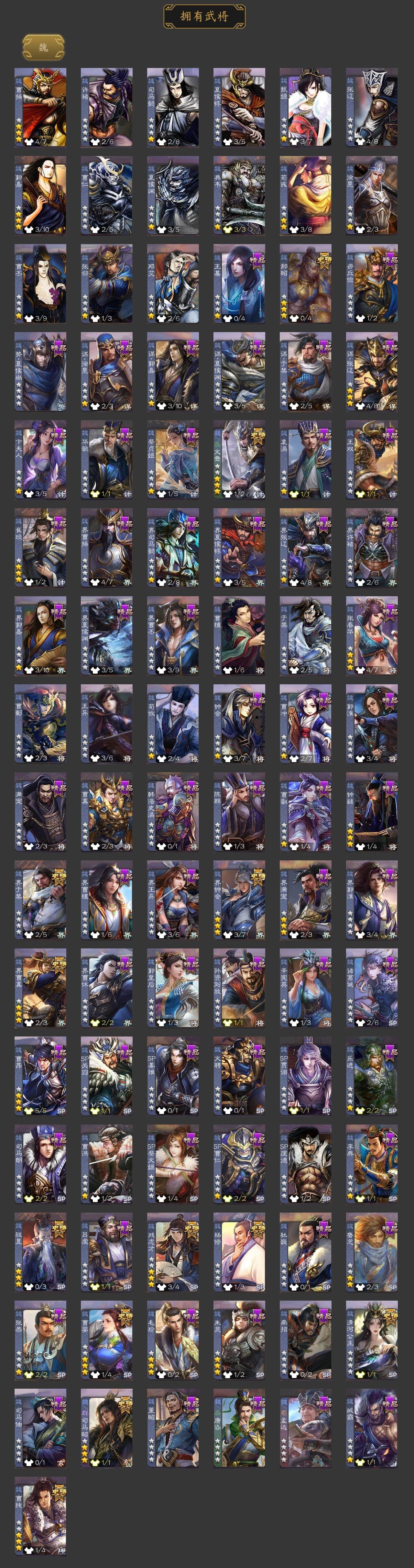 官阶:大将军;VIP等级:VIP9;史诗武将数量:52;动态皮肤数量:52;武将总数:396;史诗宝珠数量:1;将魂数量:1796;神将:8;魏国史诗武将:22;蜀国史诗武将:9;吴国史诗武将:8;群史诗武将:20