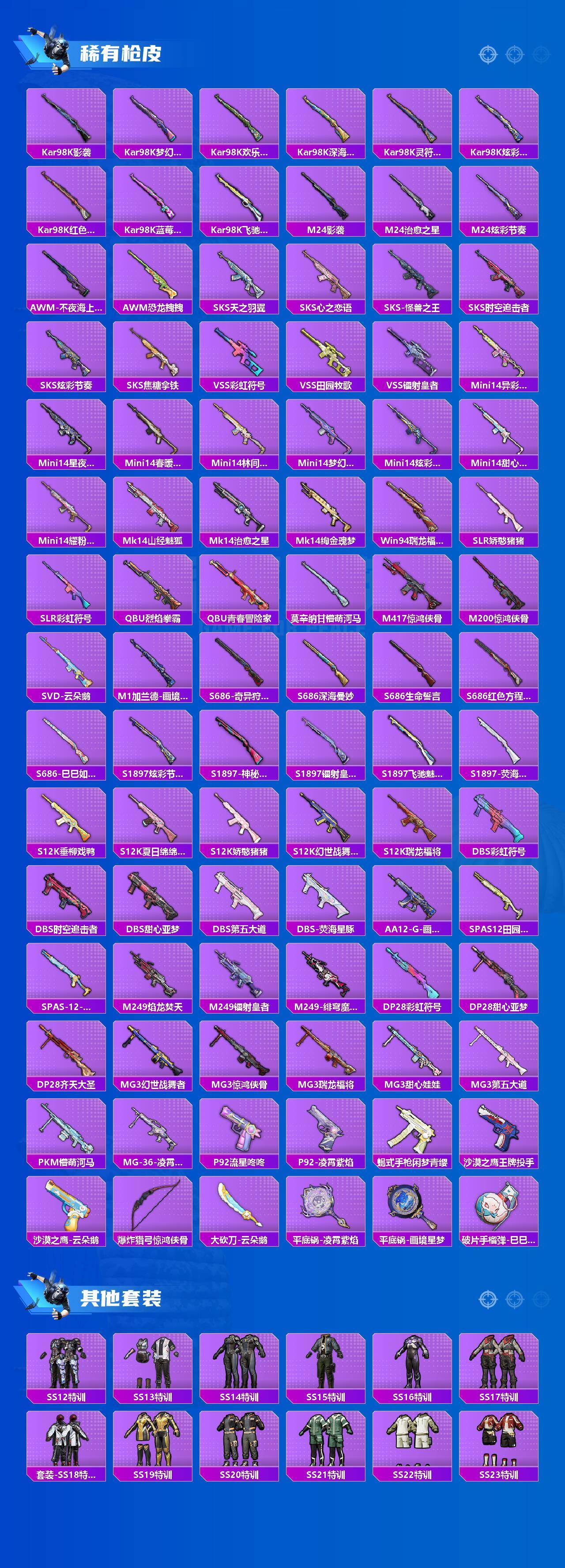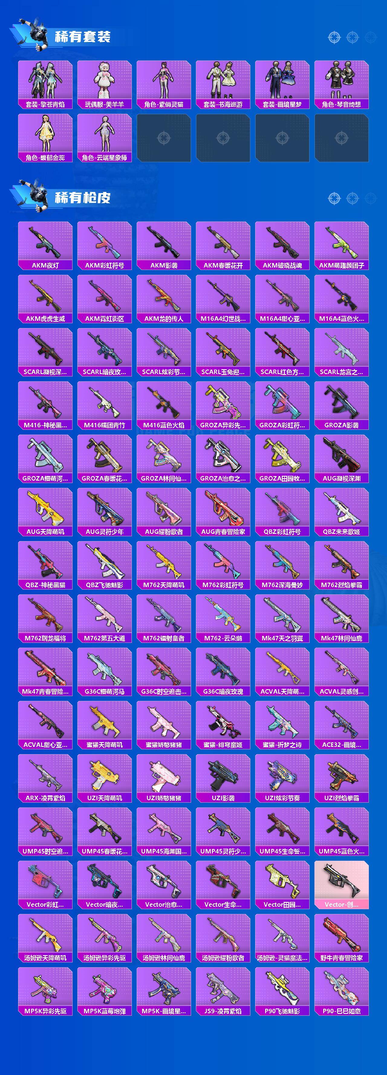 【粉色套装】:粉装-深海曼妙,粉装-蝶舞迷情,粉装-梦幻火箭,粉装-极致幻想,粉装-骨龙祭渊,粉装-暗夜玫瑰,粉装-林间仙鹿,粉装-彩虹鹿灵,粉装-山涧鹿灵,角色-洛天依,粉装-甜心娃娃,粉装-精灵娃娃,粉装-酣梦娃娃,粉装-碧影闪光,角色-智耀战神,角色