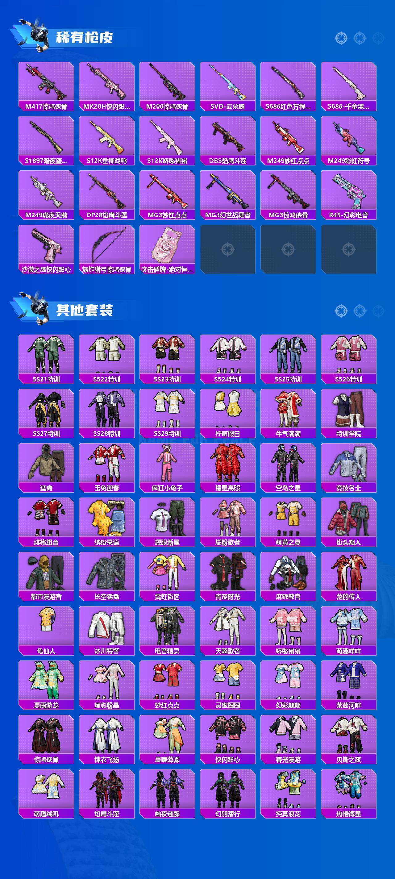 【粉色枪皮等级】:AKM-绿萝繁花(五级),SCAR-L-锦绣绵绵(五级),M416-电玩时刻(五级),GROZA-镜光银凌(五级),Kar98K-巳巳如意(五级),MG3-洛神天依(七级)