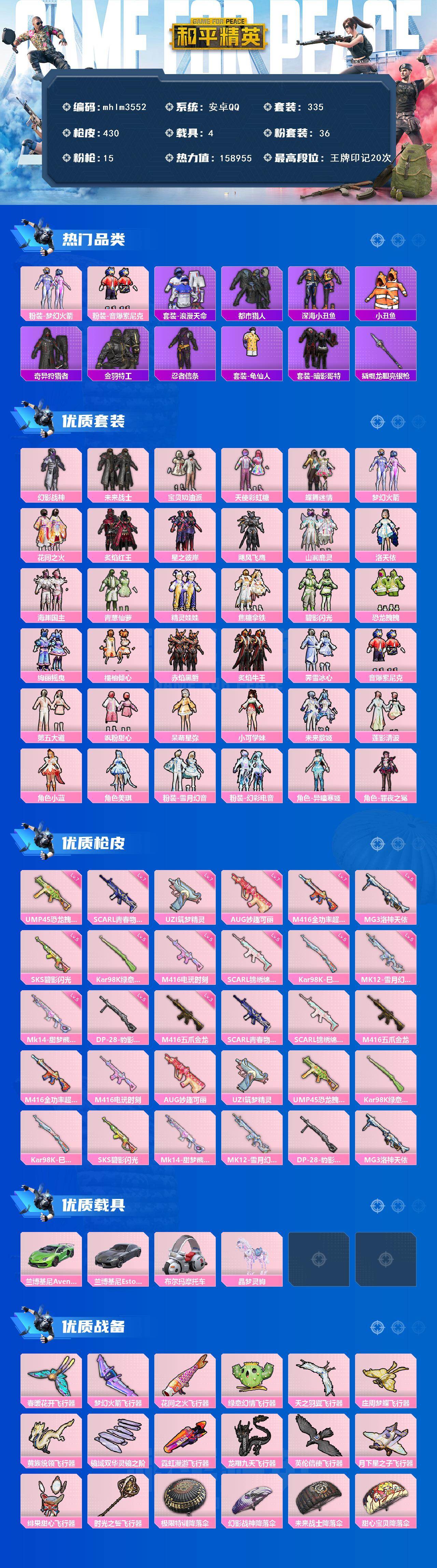 安卓 手Q-36粉装-15特效枪-4载具-16粉色飞行器-158955热力值-20王牌印记-335套装-430枪皮