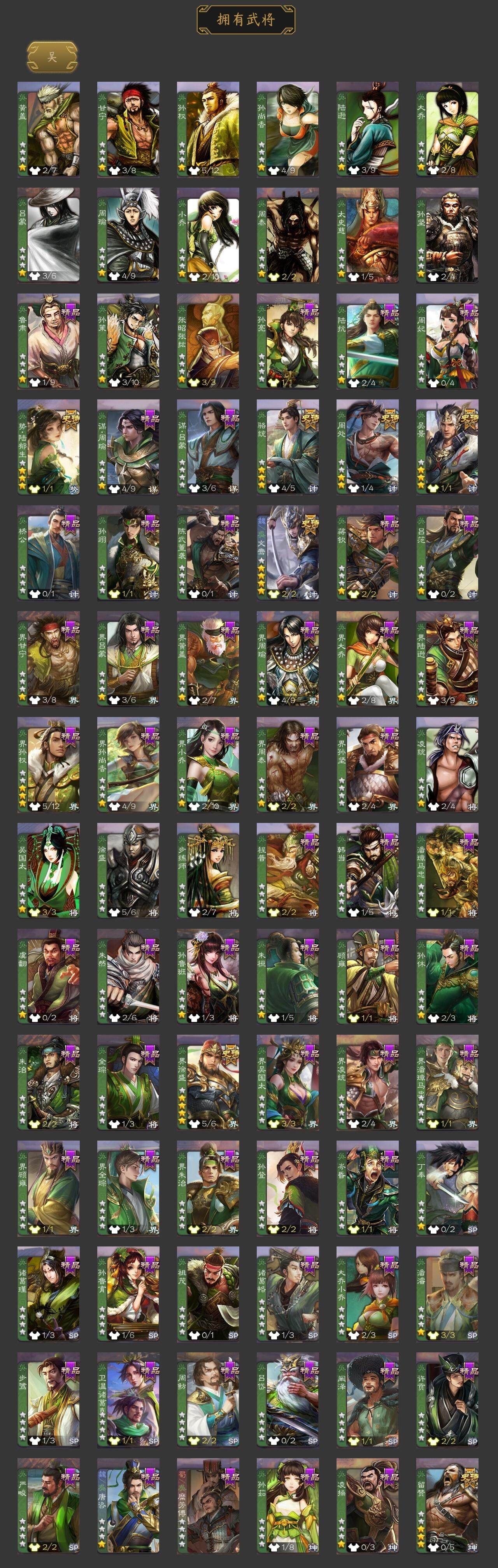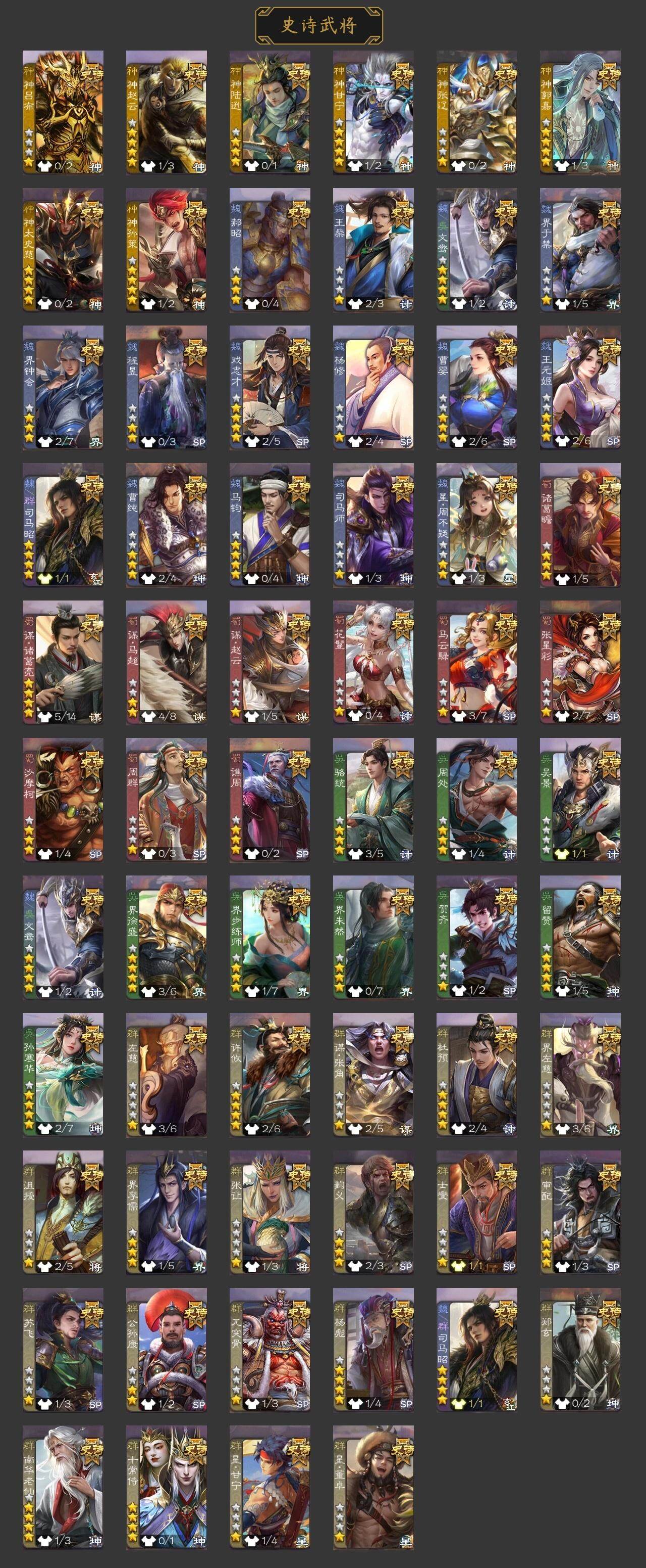 神曹操,神赵云,神甘宁,神张辽,神孙策,神华佗,神诸葛亮,SP司马昭,星周不疑,王粲,杨修,界钟会,嵇康,曹纯,戏志才,程昱,关索,马云騄,谋黄忠,谋马超,诸葛瞻,周群,张星彩,王平,沙摩柯,谯周,界黄忠,花鬘,董允,周处,吴景,骆统,留赞,界徐盛,势陆郁生,文鸯,界沮授,左慈,