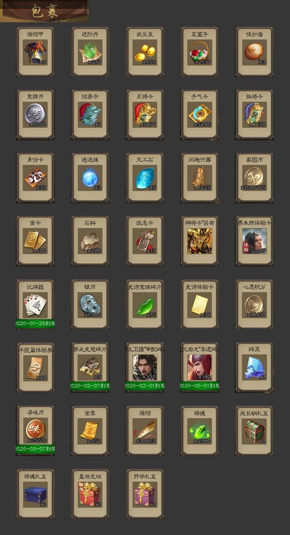 官阶:大将军;VIP等级:VIP11;史诗武将数量:50;动态皮肤数量:49;武将总数:387;史诗宝珠数量:0;将魂数量:2980;神将:7;魏国史诗武将:33;蜀国史诗武将:13;吴国史诗武将:8;群史诗武将:15