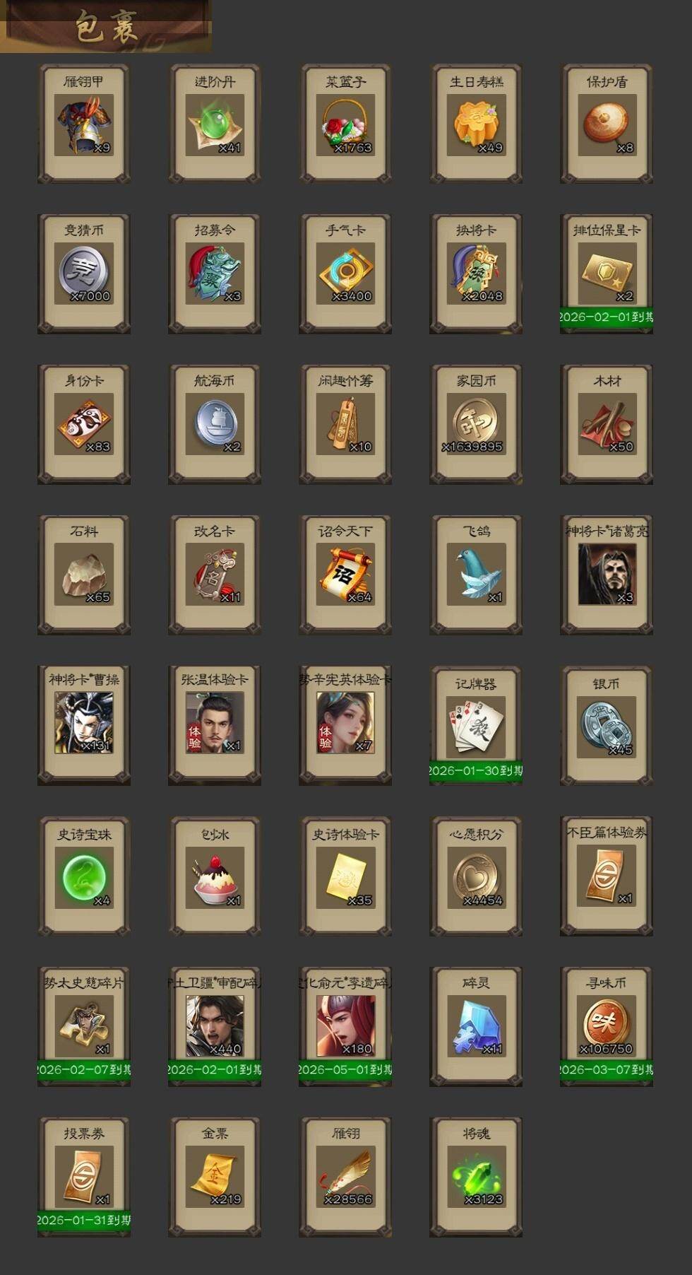 官阶:大将军;VIP等级:VIP11;史诗武将数量:70;动态皮肤数量:60;武将总数:452;史诗宝珠数量:4;将魂数量:3123;神将:7;魏国史诗武将:29;蜀国史诗武将:13;吴国史诗武将:10;群史诗武将:24
