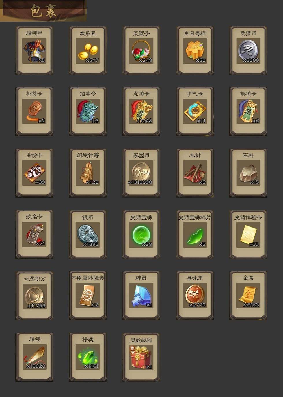 官阶:大将军;VIP等级:VIP8;史诗武将数量:42;动态皮肤数量:42;武将总数:395;史诗宝珠数量:28;将魂数量:1161;神将:7;魏国史诗武将:33;蜀国史诗武将:9;吴国史诗武将:3;群史诗武将:15