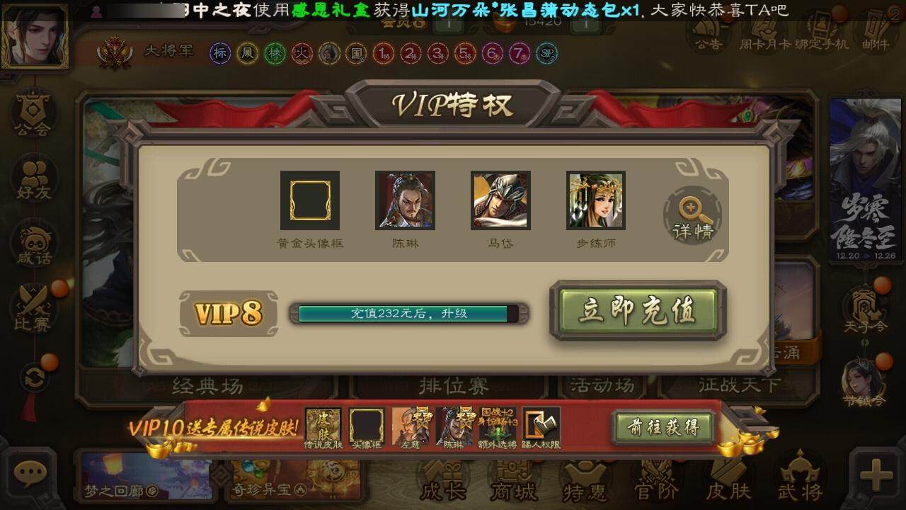 官阶:大将军;VIP等级:VIP8;史诗武将数量:42;动态皮肤数量:42;
