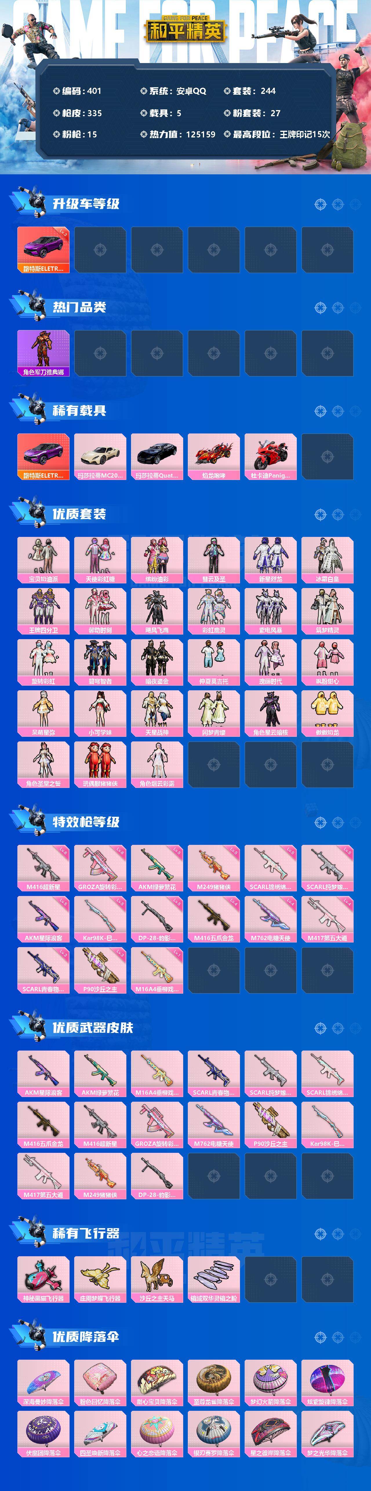 【商品标题】:安卓 手Q-27粉装-15特效枪-5载具-4粉色飞行器-125159热力值-15王牌印记-244套装-335枪皮