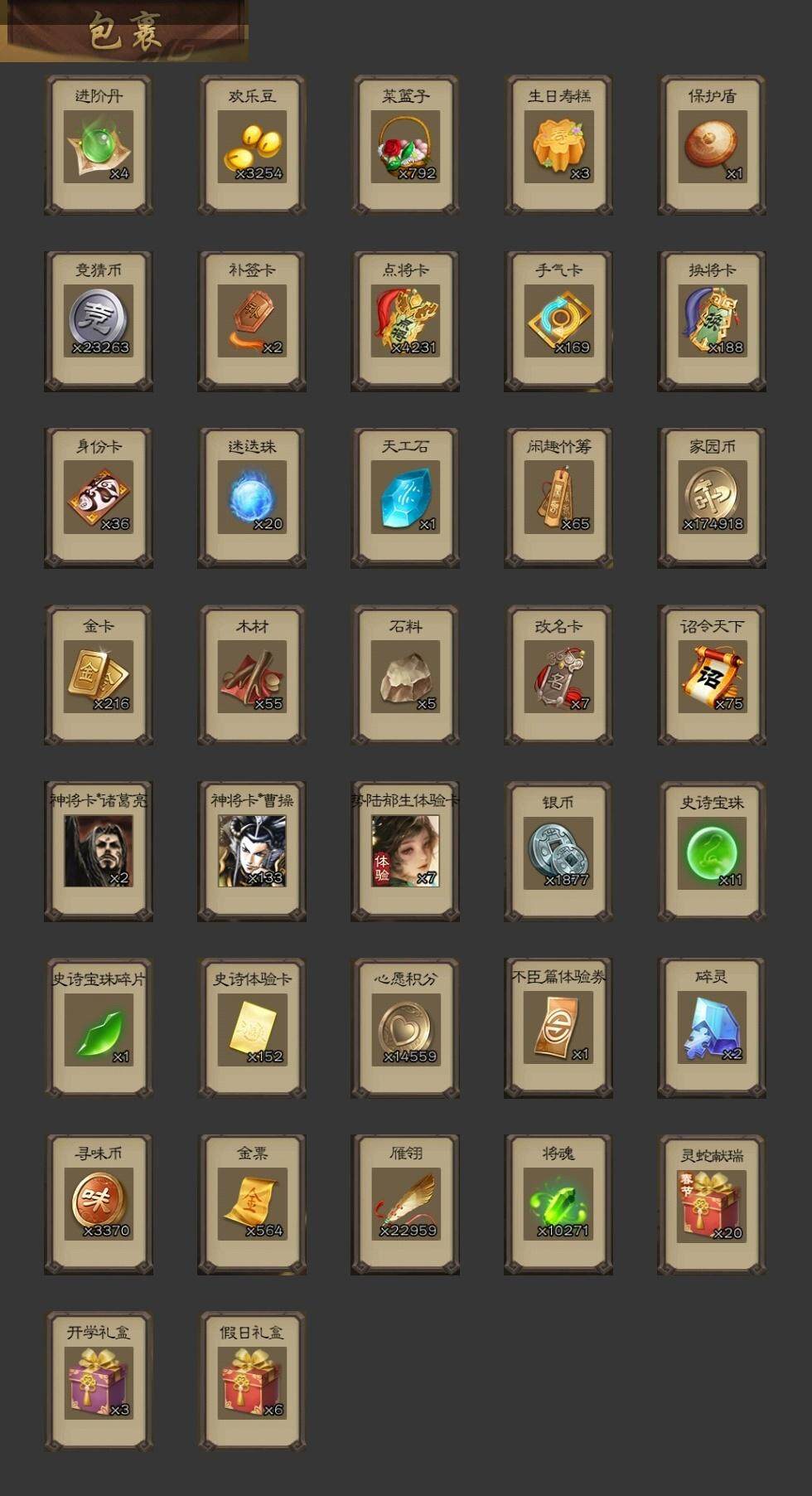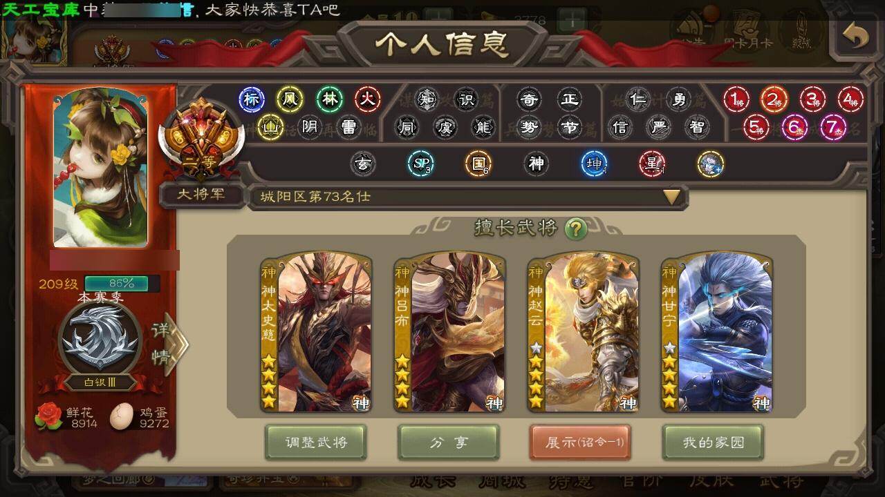 官阶:大将军;VIP等级:VIP10;史诗武将数量:52;动态皮肤数量:45;武将总数:405;史诗宝珠数量:11;将魂数量:10271;神将:8;魏国史诗武将:32;蜀国史诗武将:10;吴国史诗武将:7;群史诗武将:19