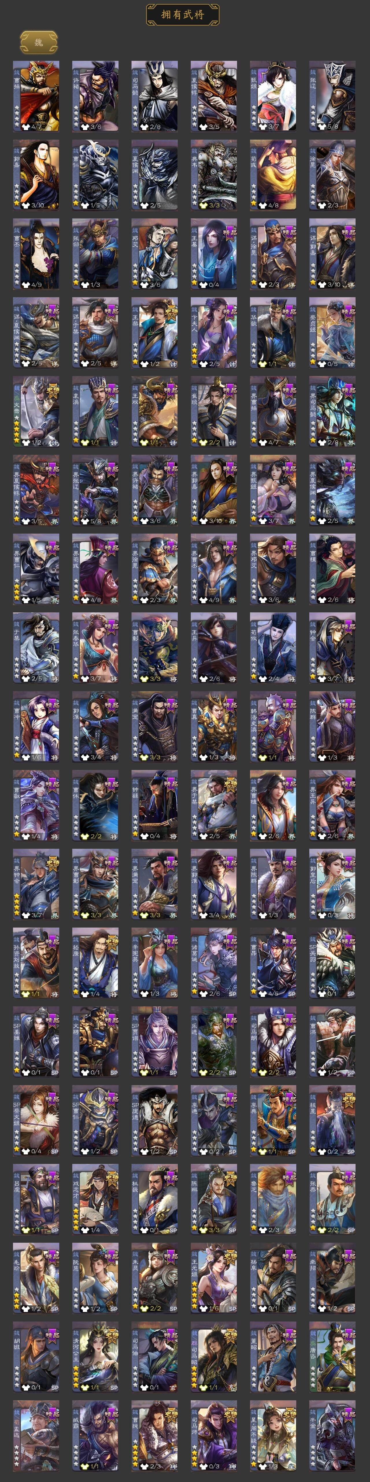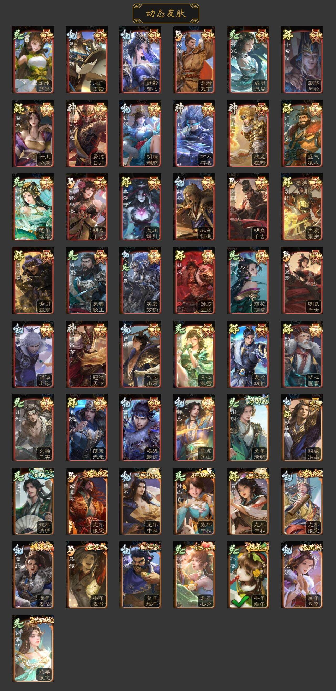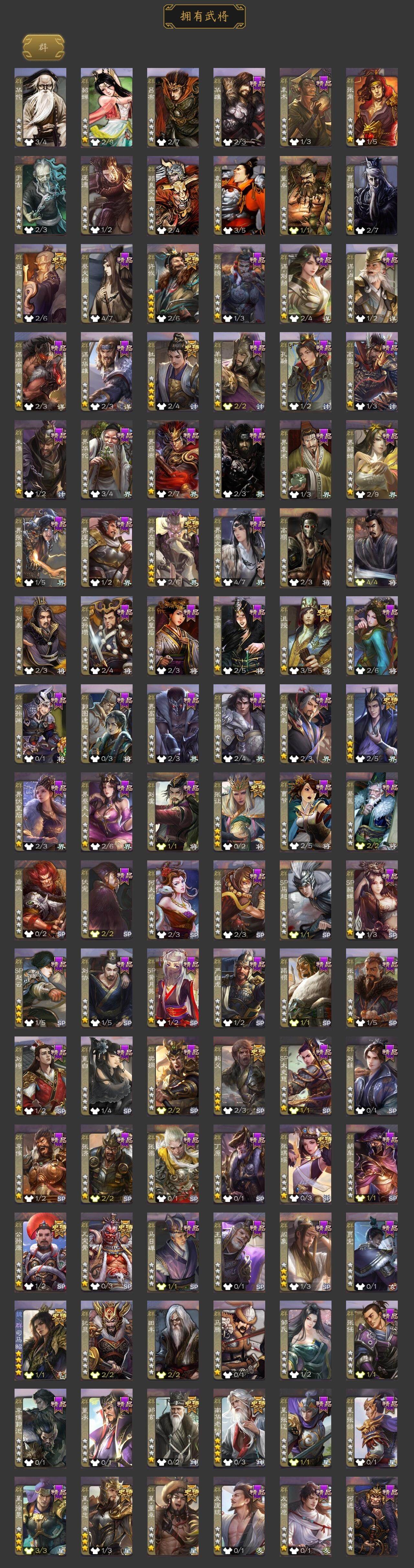 神吕布,神赵云,神陆逊,神甘宁,神张辽,神太史慈,神吕蒙,神周瑜,星周不疑,王粲,文鸯,王元姬,魏-司马昭,司马师,界钟会,界于禁,嵇康,陈琳,曹纯,戏志才,清河公主,关索,谋赵云,谋马超,诸葛瞻,周群,张星彩,王平,沙摩柯,花鬘,董允,孙寒华,骆统,留赞,界朱然,界徐盛,界