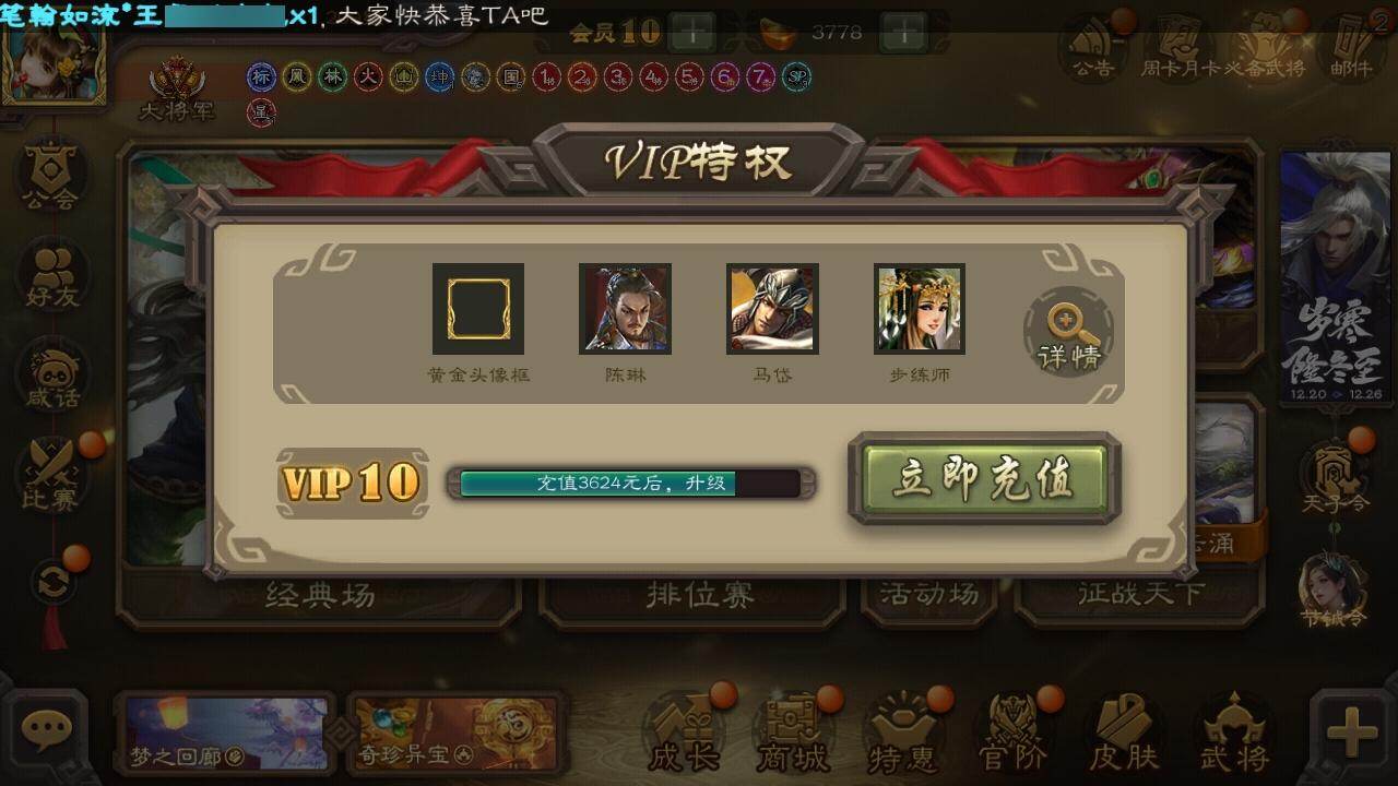官阶:大将军;VIP等级:VIP10;史诗武将数量:52;动态皮肤数量:45