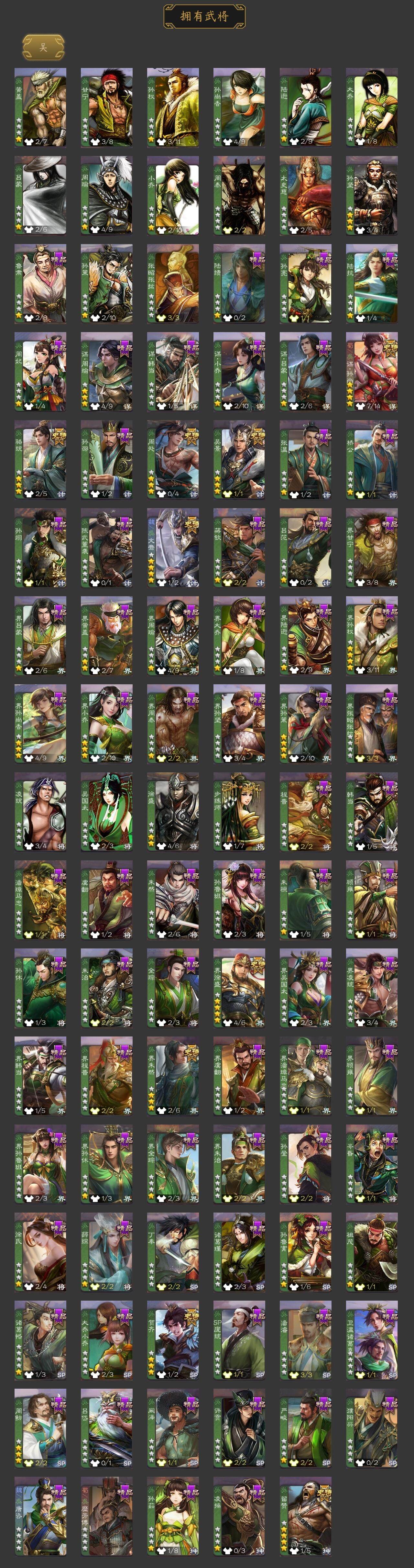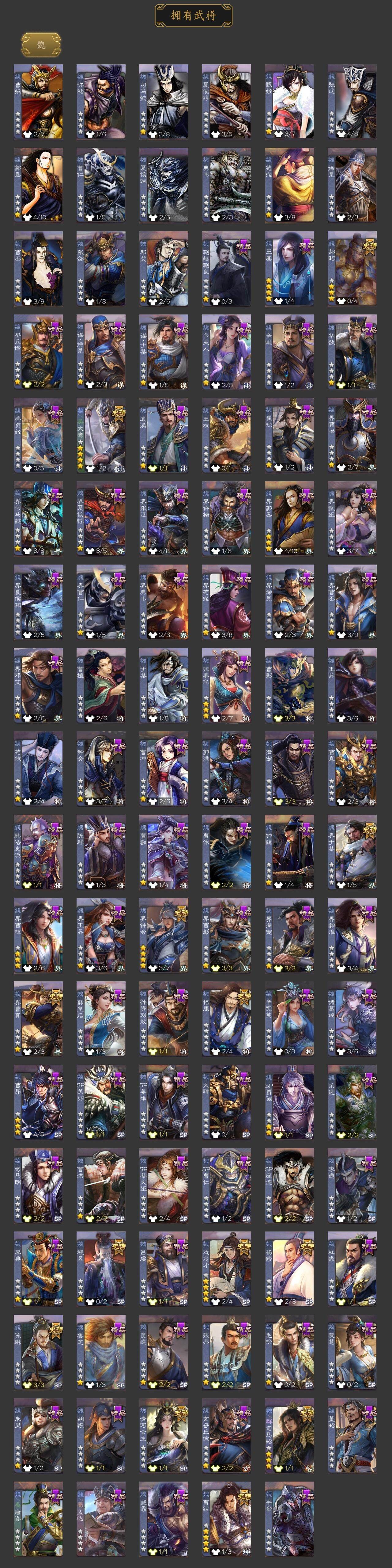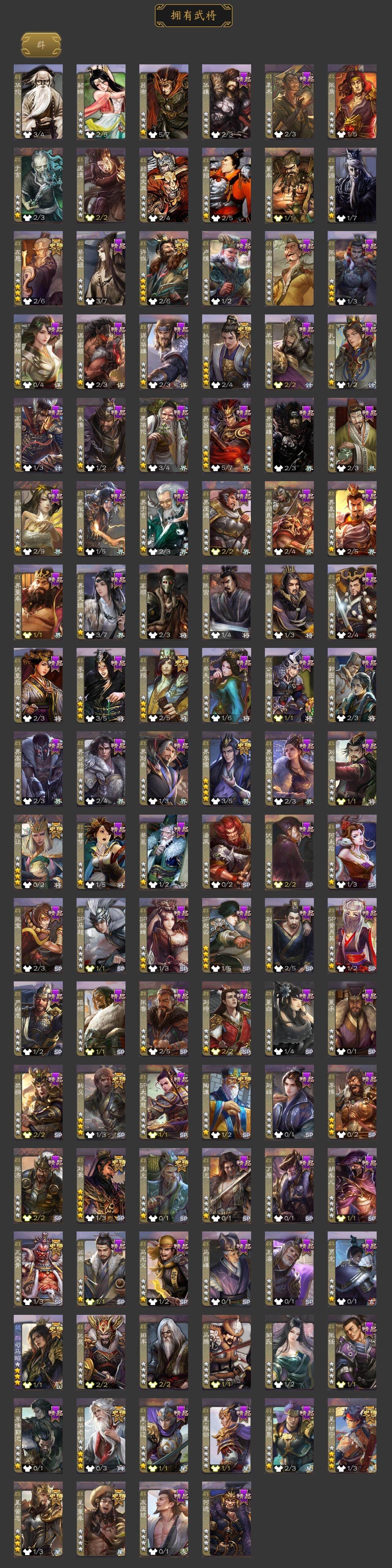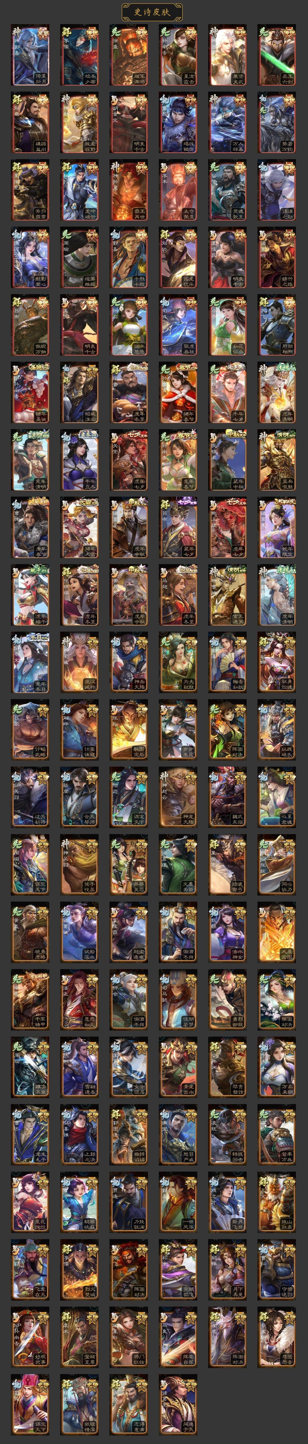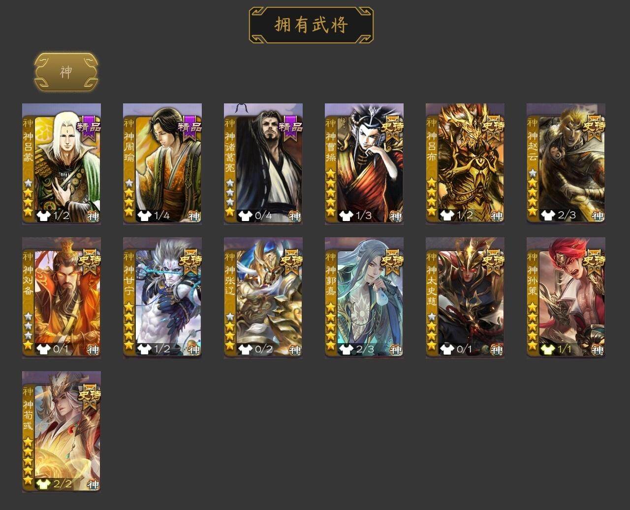 神曹操,神吕布,神赵云,神刘备,神甘宁,神张辽,神郭嘉,神太史慈,神孙策,神荀彧,神吕蒙,神周瑜,神诸葛亮,杨修,文鸯,魏-司马昭,界钟会,界于禁,界曹真,嵇康,郝昭,陈琳,曹纯,戏志才,清河公主,关索,谋刘备,马云騄,谋孙尚香,谋黄忠,谋赵云,谋马超,诸葛瞻,周群,赵襄,张星