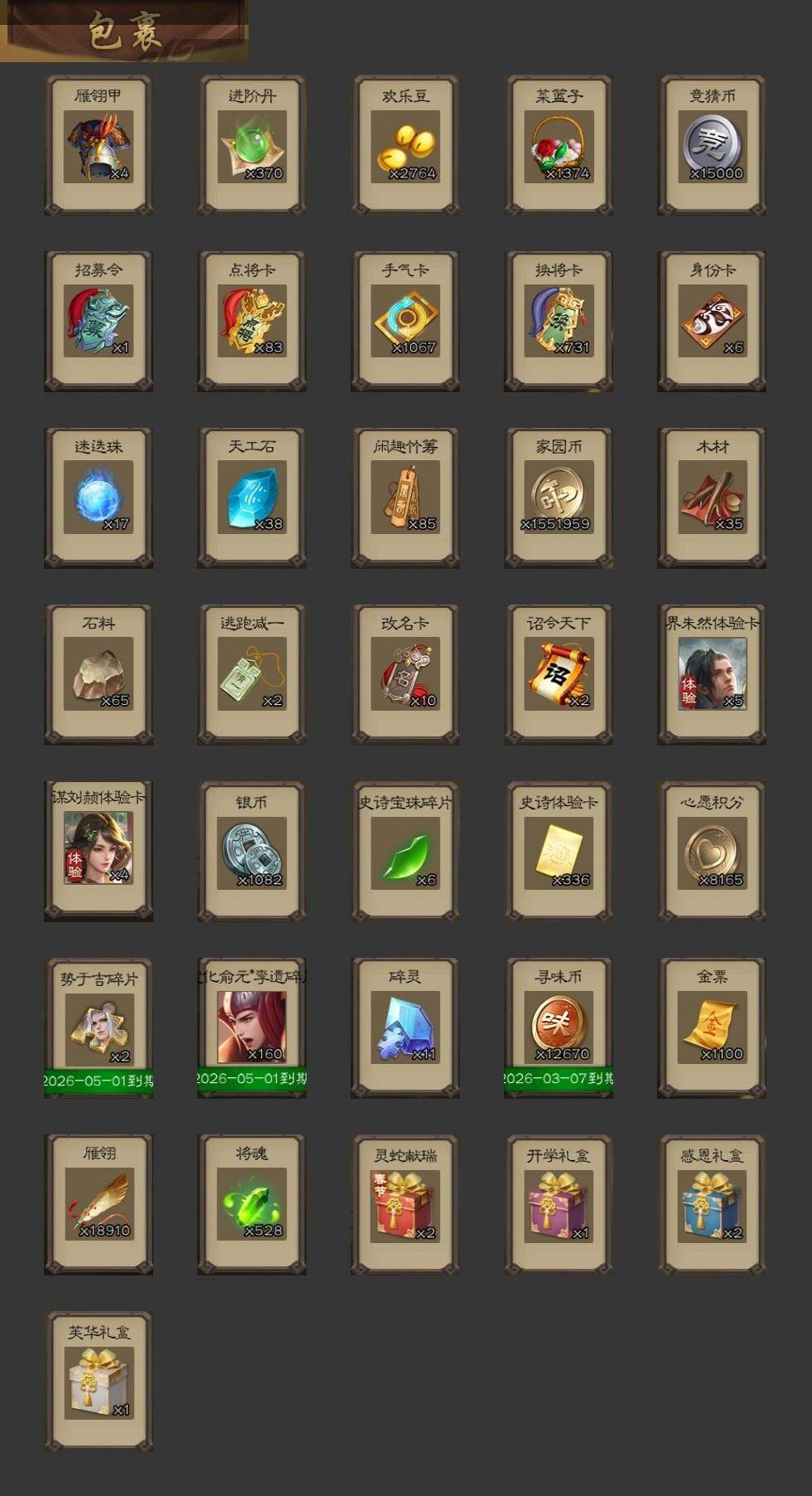 官阶:骠骑将军;VIP等级:VIP8;史诗武将数量:18;动态皮肤数量:14