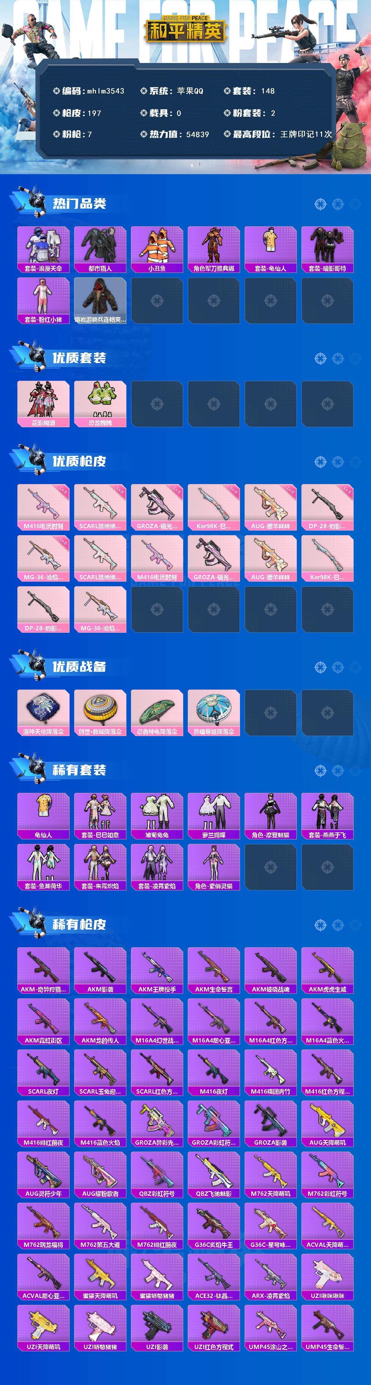 苹果 手Q-2粉装-7特效枪-0载具-1粉色飞行器-54839热力值-11王牌印记-148套装-197枪皮