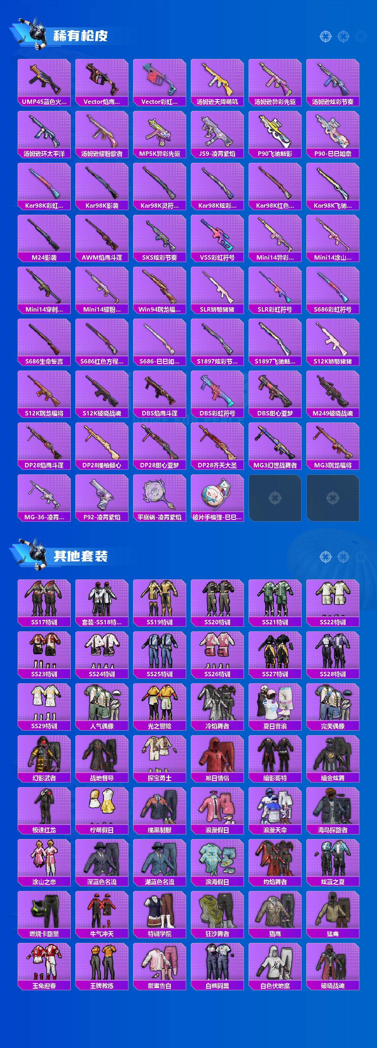【粉色枪皮等级】:SCAR-L-锦绣绵绵(五级),M416-电玩时刻(五级),GROZA-镜光银凌(五级),AUG-暖羊咩咩(五级),Kar98K-巳巳如意(五级),DP-28-豹影疾电(五级),MG-