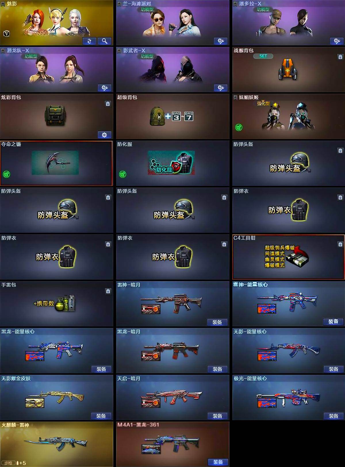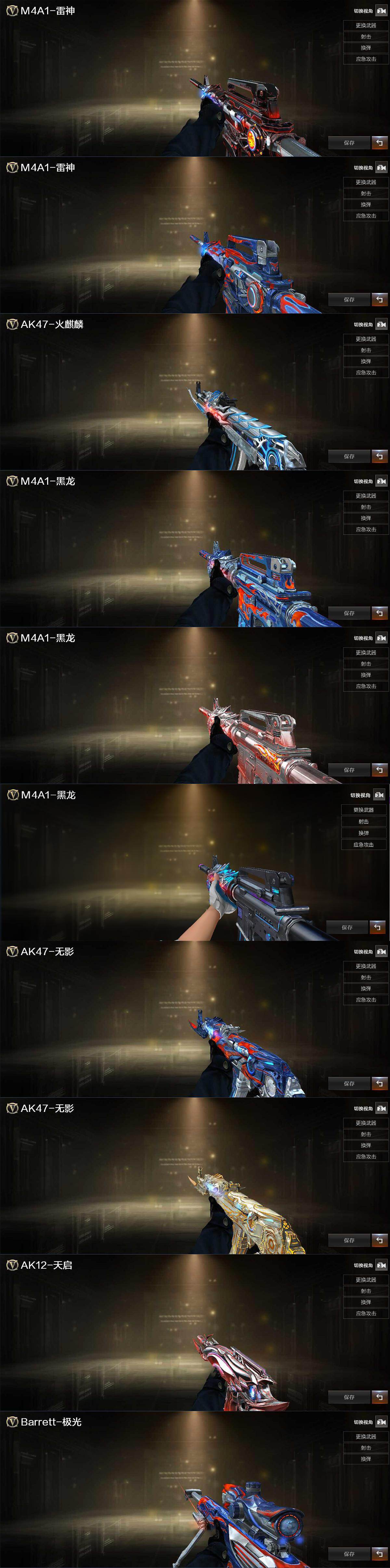【皮肤】:雷神-暗月,雷神-能量核心,火麒麟-雷神,黑龙-能量核心,黑龙-暗月,M4A1-黑龙-361,无影-能量核心,无影耀金皮肤,天启-暗月,极光-能量核心