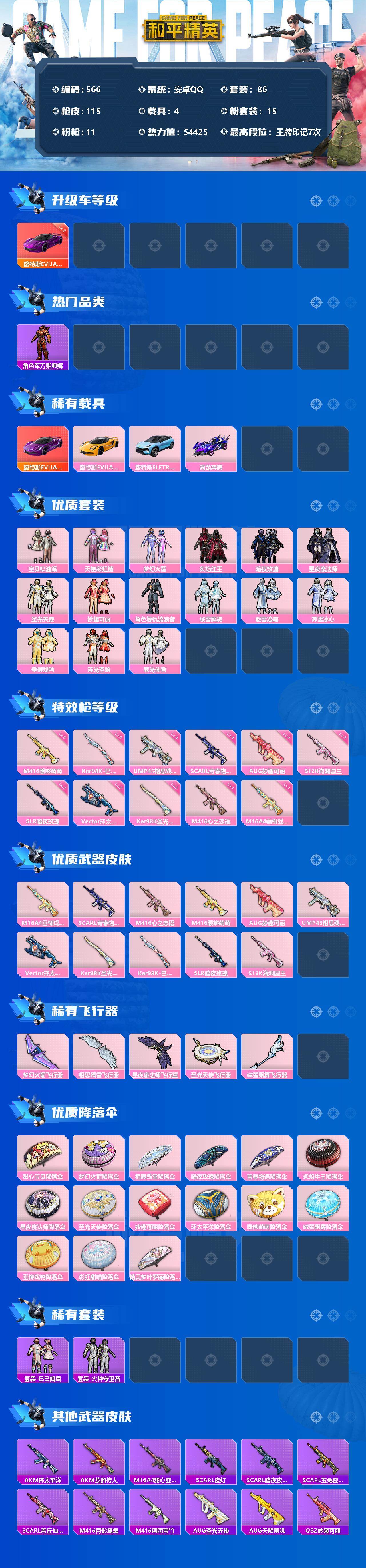 【商品标题】:安卓 手Q-15粉装-11特效枪-4载具-5粉色飞行器-54425热力值-7王牌印记-86套装-115枪皮