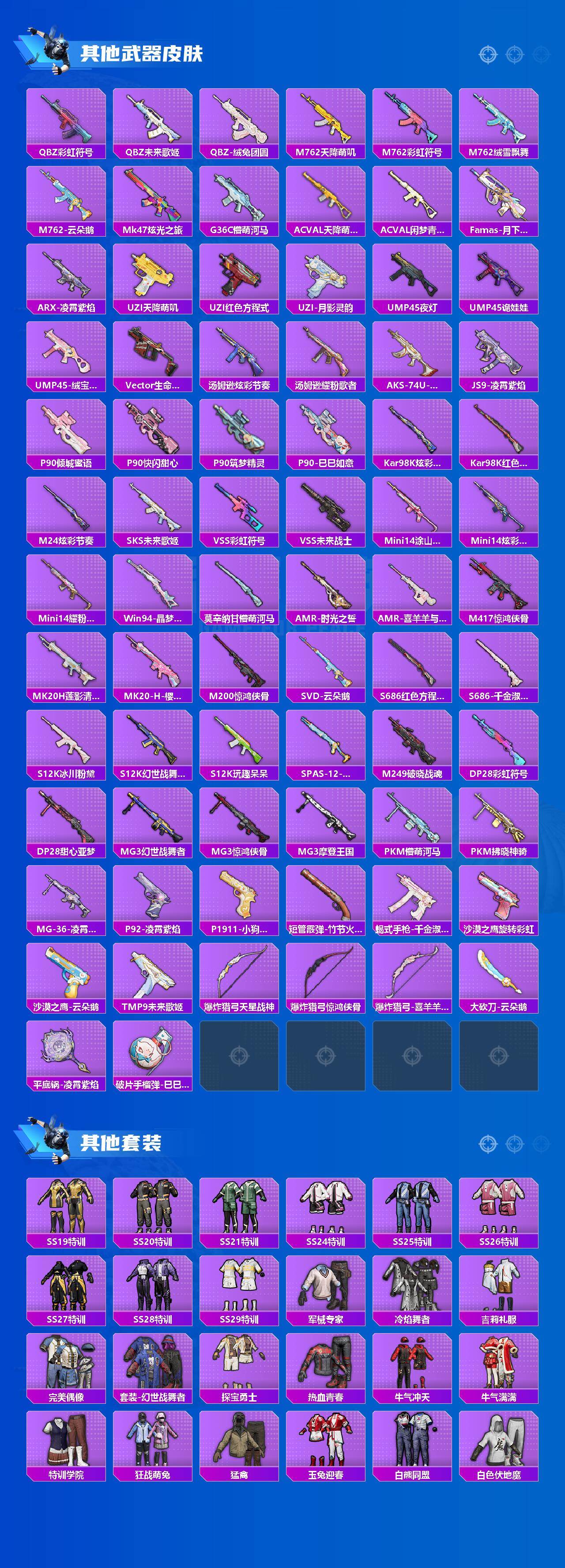 【粉色枪皮等级】:AKM-绿萝繁花(五级),M416-电玩时刻(五级),AUG-暖羊咩咩(五级),Kar98K-未来歌姬(五级),Kar98K-巳巳如意(五级),SPAS-12-蜜语绒猫(五级),DP-28-豹影疾电(五级),MG-36-沧焰双生(四级)