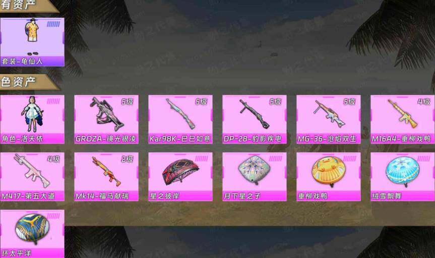 【粉色枪皮等级】:M16A4-垂柳戏鸭(四级),GROZA-镜光银凌(五级),Kar98K-巳巳如意(五级),Mk14-福马献瑞(二级),M417-第五大道(四级),DP-28-豹影疾电(五级),MG-36-沧焰双生(五级)