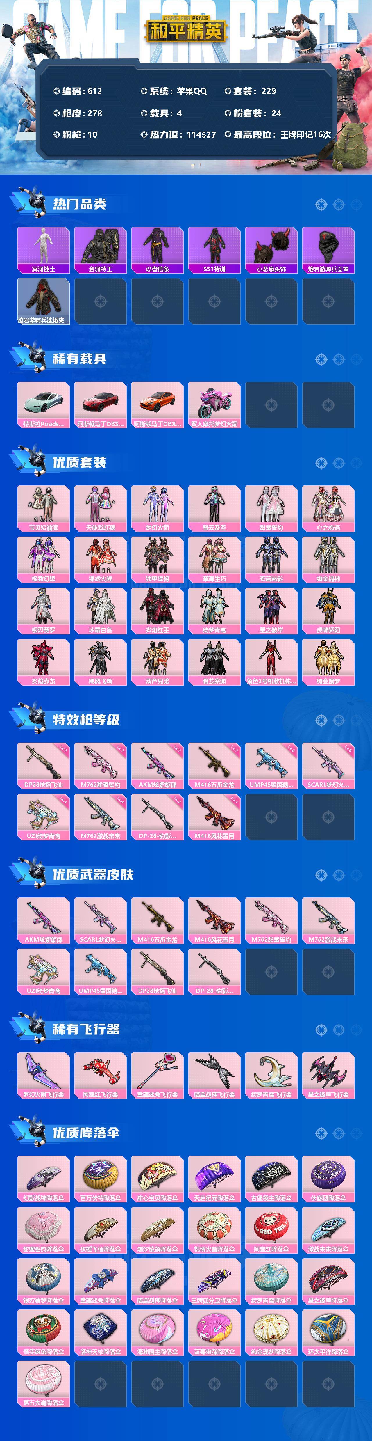 【商品标题】:苹果 手Q-24粉装-10特效枪-4载具-6粉色飞行器-114527热力值-16王牌印记-229套装-278枪皮