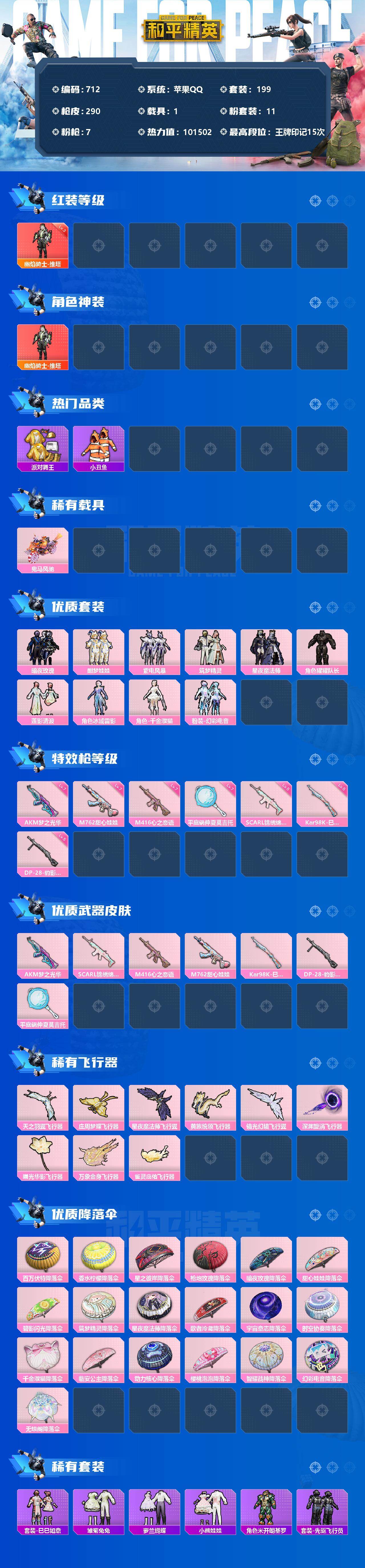 【商品标题】:苹果 手Q-1神装-11粉装-7特效枪-1载具-9粉色飞行器-101502热力值-15王牌印记-199套装-290枪皮