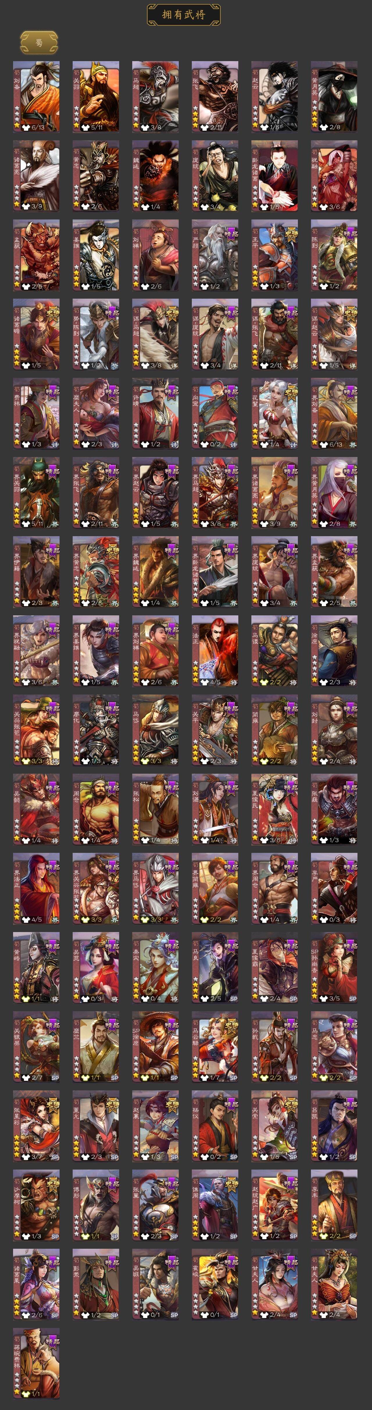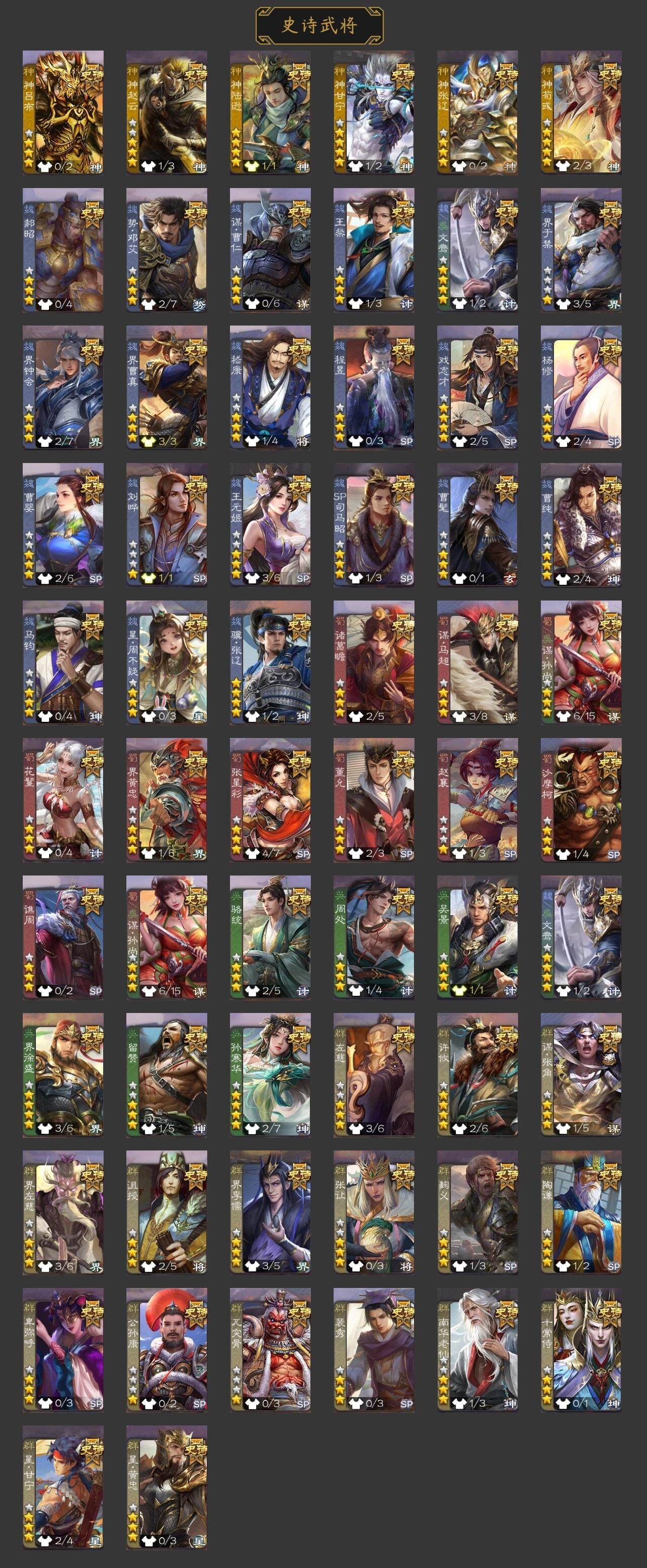 神吕布,神赵云,神陆逊,神刘备,神张辽,神荀彧,神关羽,神吕蒙,神周瑜,神诸葛亮,神鲁肃,SP司马昭,星周不疑,杨修,文鸯,司马师,界钟会,界于禁,界曹真,嵇康,郝昭,陈琳,曹纯,戏志才,刘晔,清河公主,关索,马云騄,谋赵云,谋马超,诸葛瞻,赵襄,张星彩,王平,沙摩柯,谯周,界