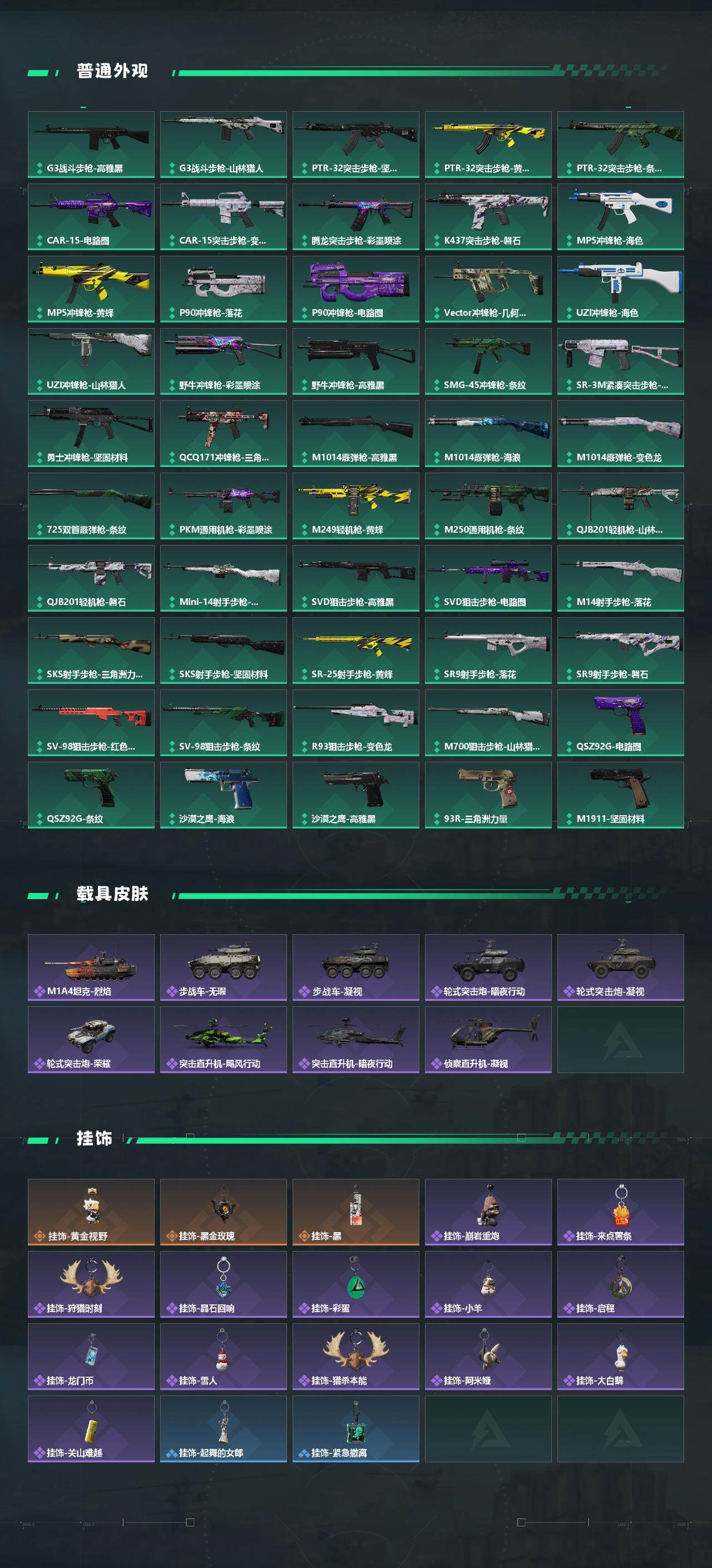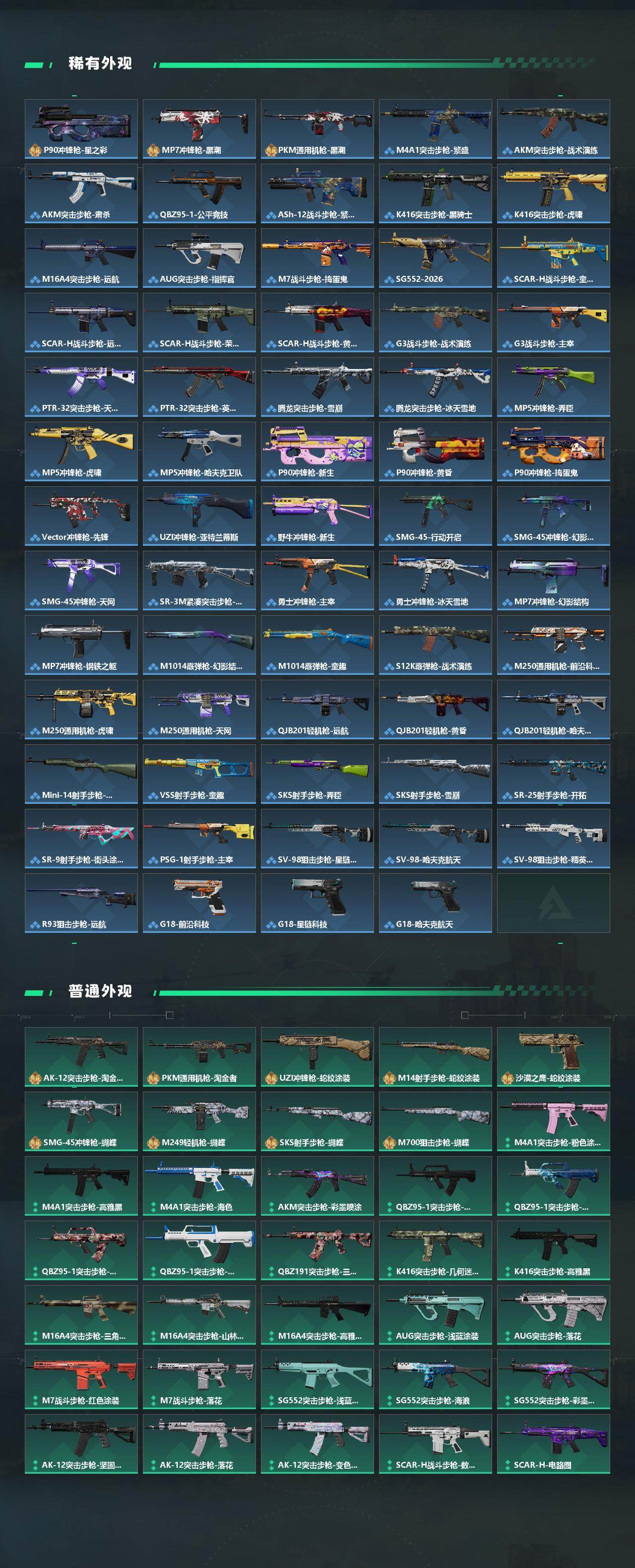 【传说外观】:M4A1突击步枪-蚀金玫瑰,M4A1突击步枪-阿米娅,ASh-12战斗步枪-鹅鸭杀,M16A4突击步枪-狩猎时刻,SG552突击步枪-运动员,AK-