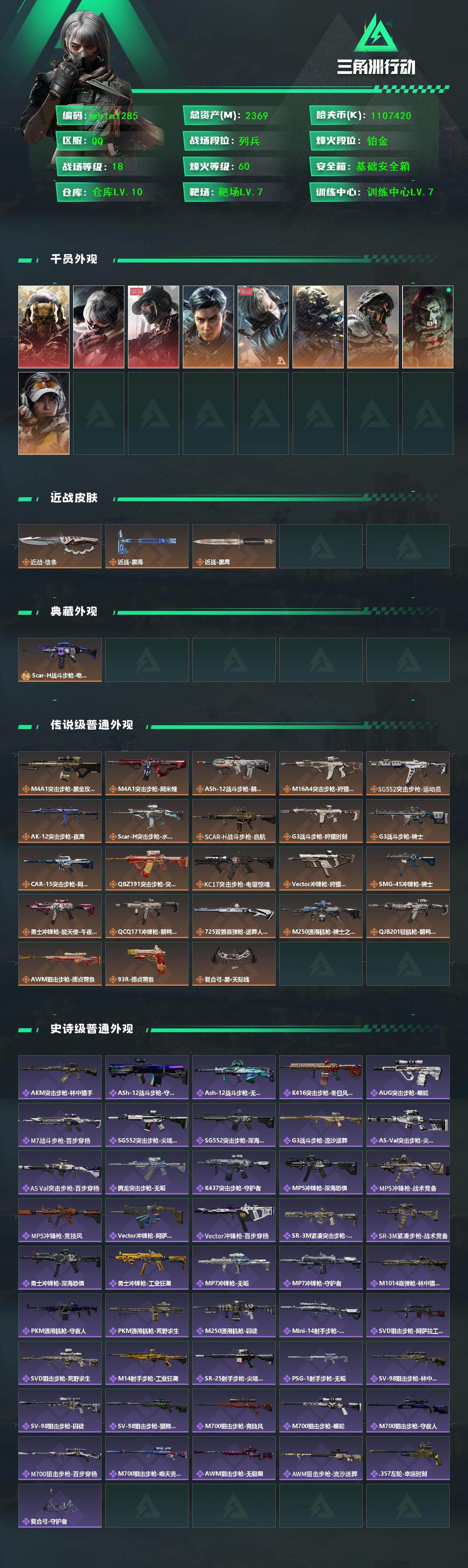 2369m总资产-1107420k哈伏币-60烽火等级-铂金-18战场等级-列兵