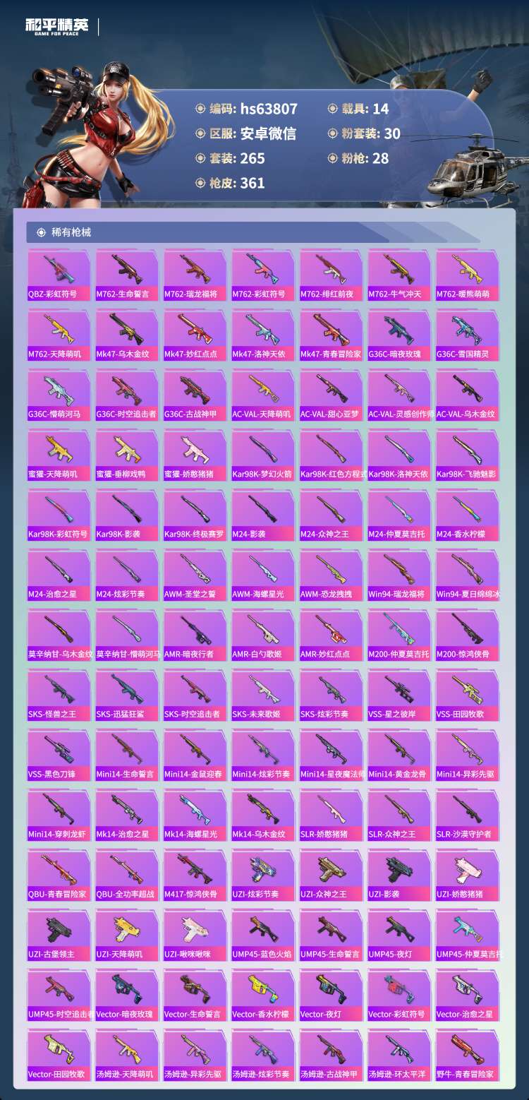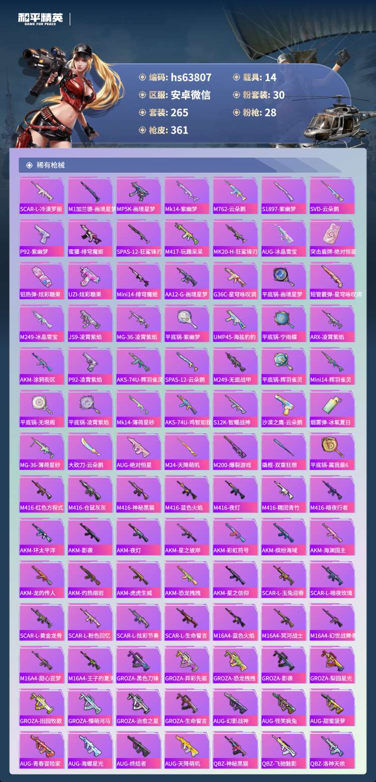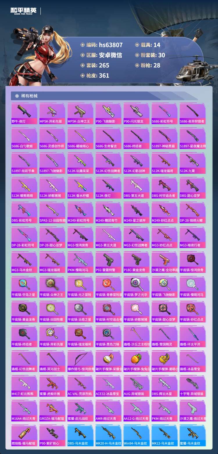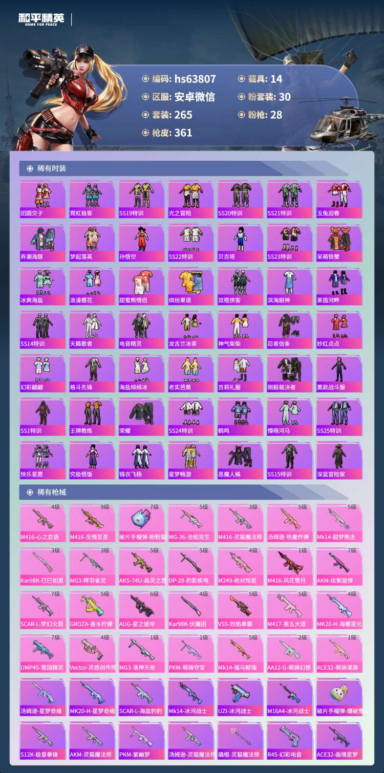 hs63807 安卓微-25王牌印记-2红装-30粉装-28特效枪-14载具-163938热力值-