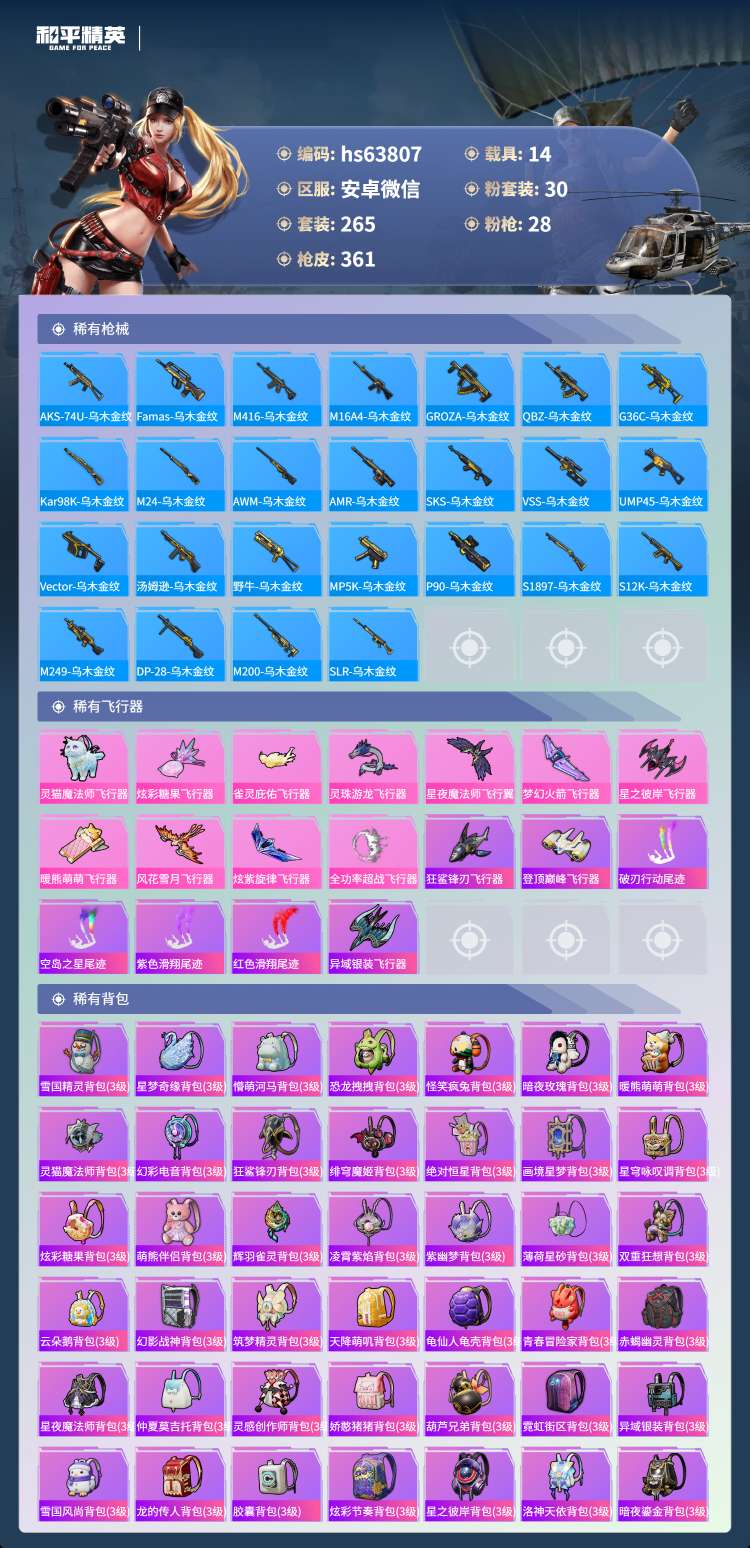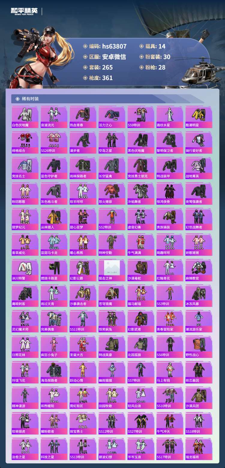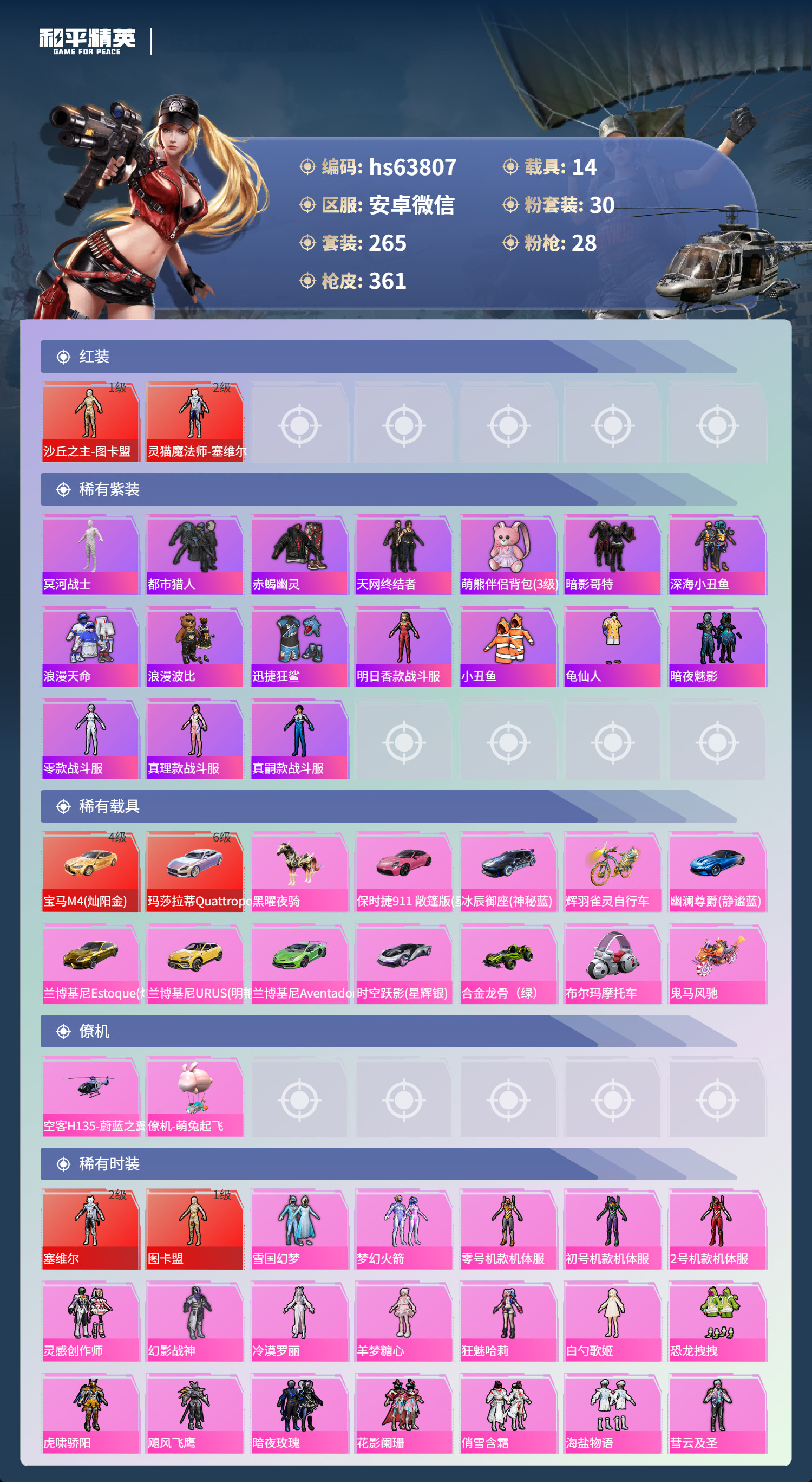 hs63807 安卓微-25王牌印记-2红装-30粉装-28特效枪-14载具-163938热力值-
