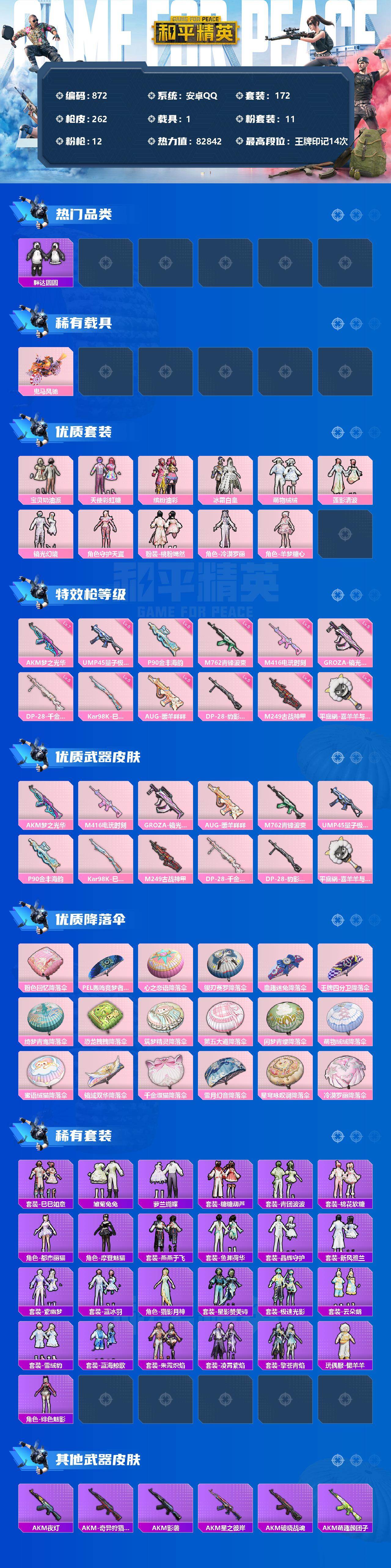 【商品标题】:安卓 手Q-11粉装-12特效枪-1载具-0粉色飞行器-82842热力值-14王牌印记-172套装-262枪皮
