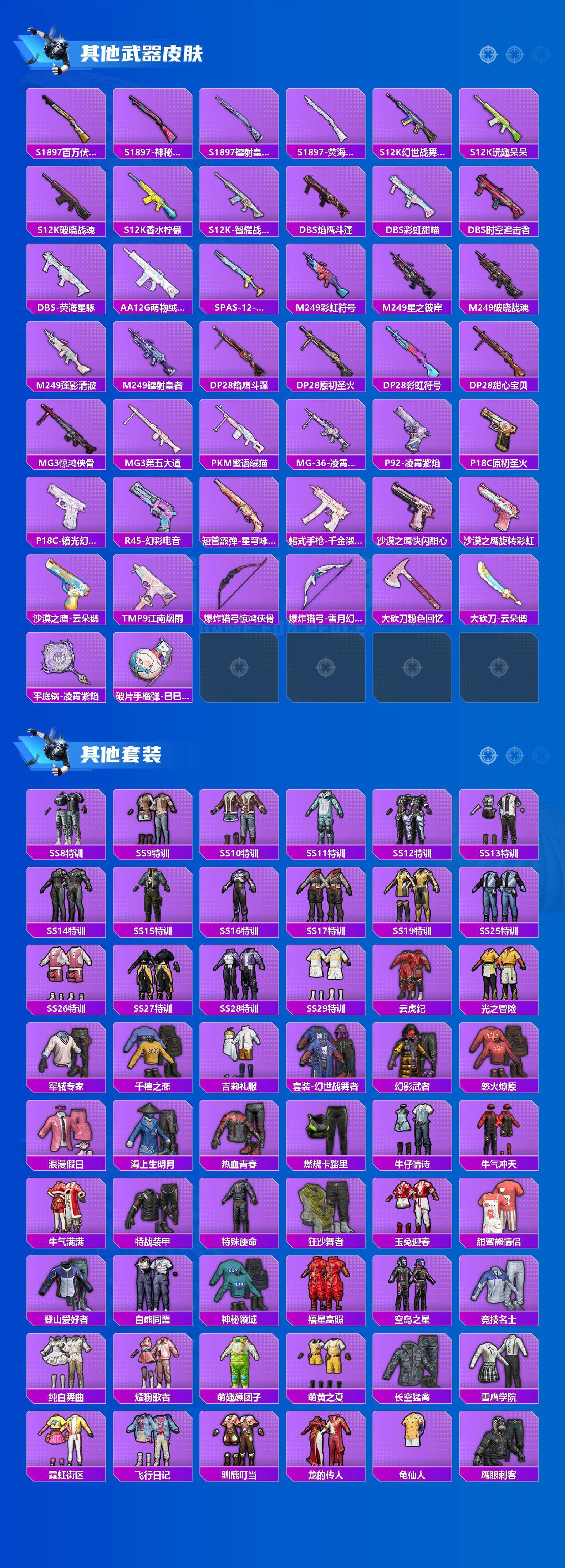 【粉色套装】:粉装-宝贝奶油派,粉装-天使彩虹糖,粉装-缤纷油彩,粉装-冰霜白皇,粉装-萌物绒绒,粉装-莲影清波,粉装-镜光幻境,角色-守护天翼,粉装-桃粉嫣然,角色-冷漠罗丽,角色-羊梦糖心