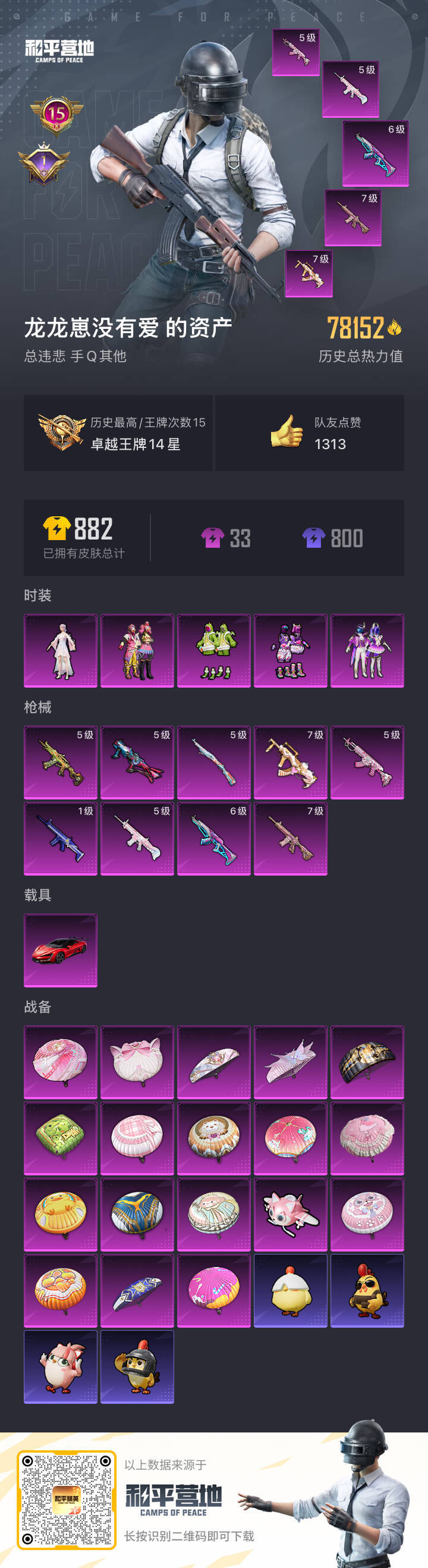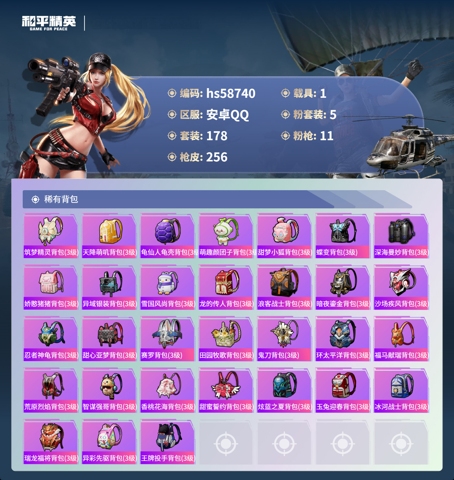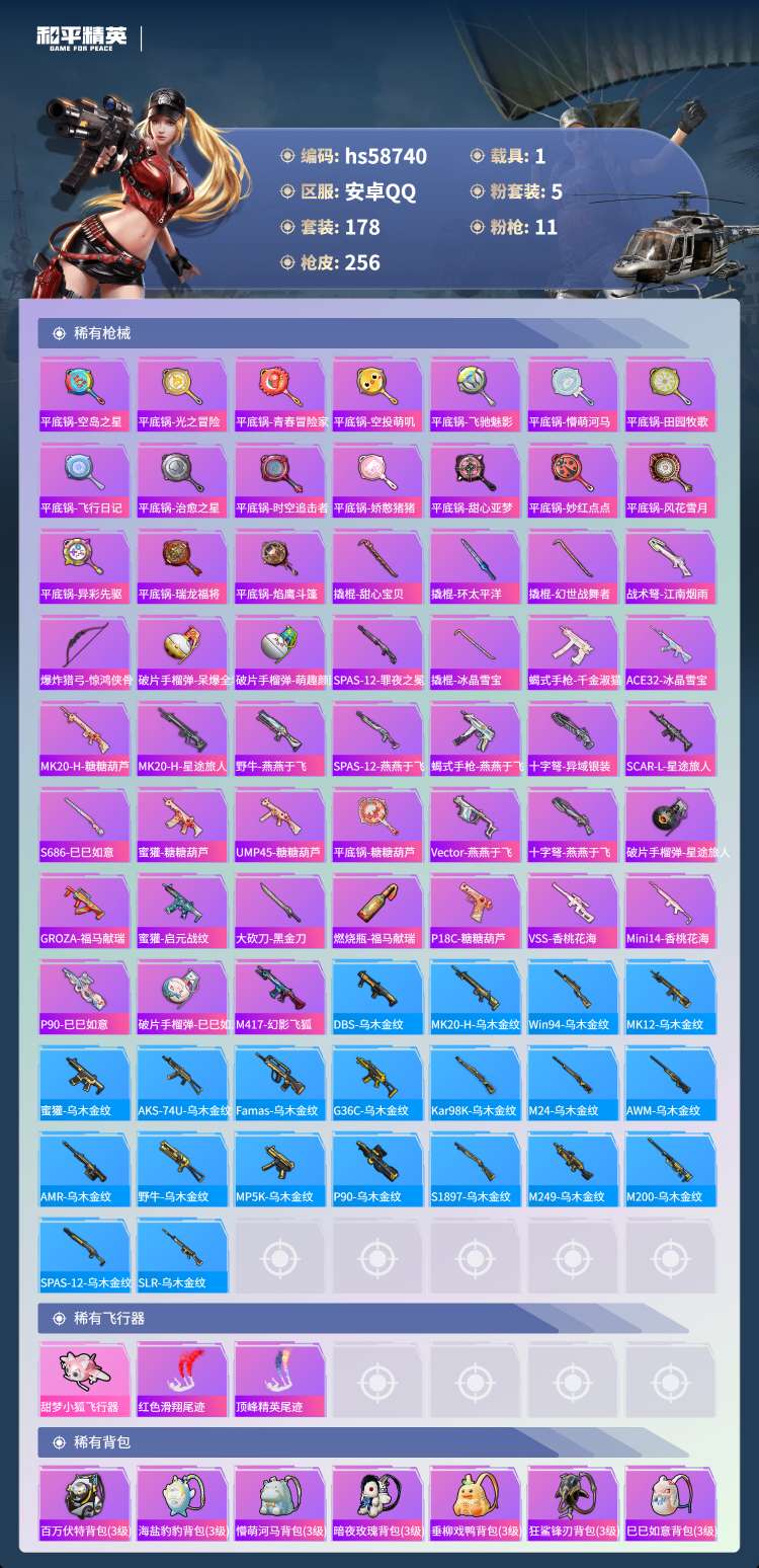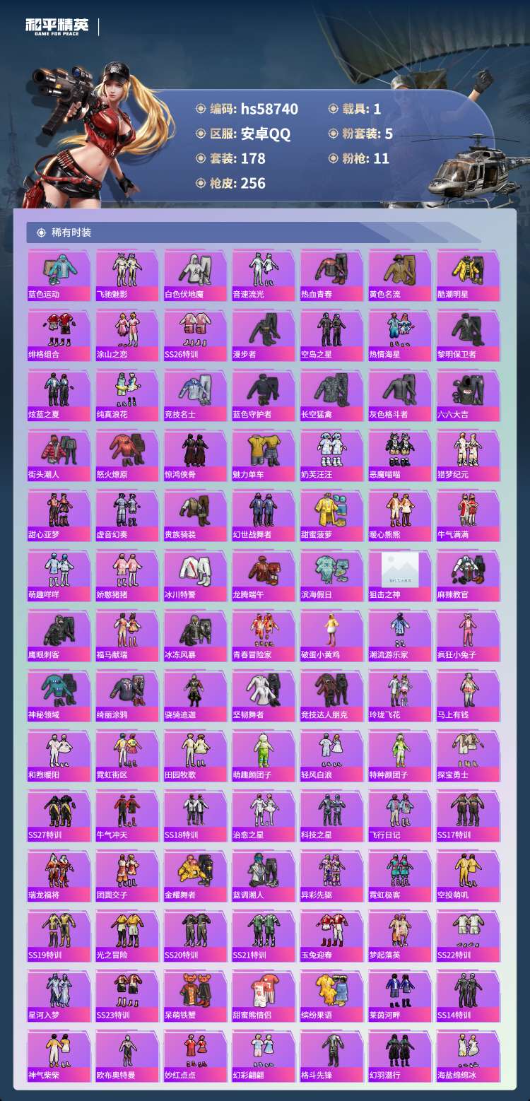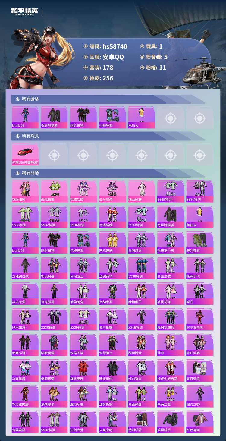 hs58740 安卓手Q-16王牌印记-5粉装-11特效枪-1载具-80869热力值-178套装-2