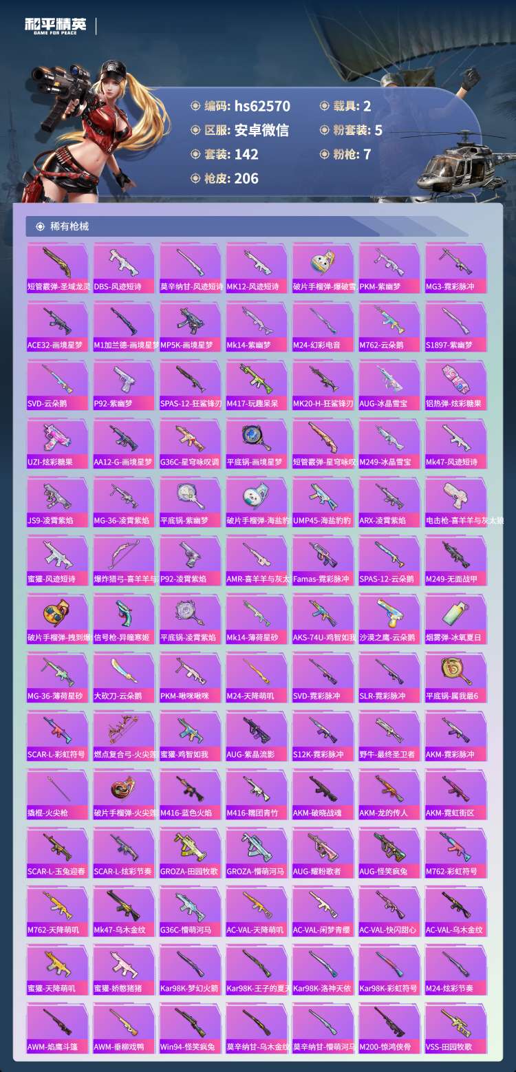 hs62570 安卓微-11王牌印记-1红装-5粉装-7特效枪-2载具-66819热力值-142套